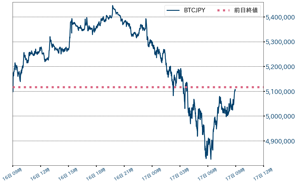 先週(9日〜16日)のビットコイン(BTC)対円相場の週足は、前週比1,242,529円(19.58%)安の5,104,471円と、2月第4週ぶりに週間で100万円を超える下げ幅を記録し急落。前週まで6週続伸したイーサリアムのイーサ(ETH)も、週足で33,054円(7.73%)安い934,595円と節目の40万円を割り込んだ。