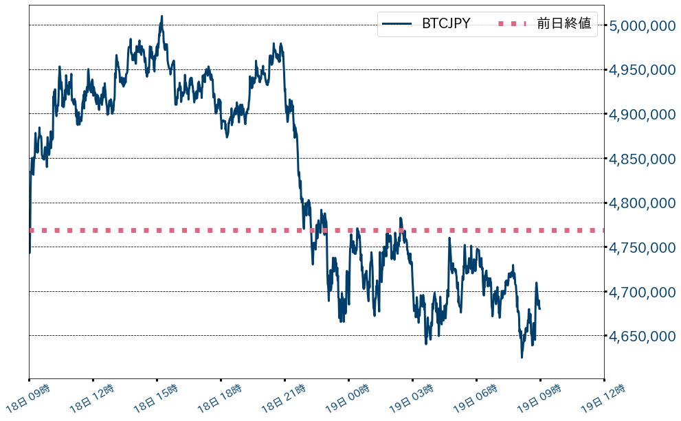 18日のビットコイン(BTC)対円相場は88,442円(1.85%)安の4,680,000円と4日続落。ただ、昨日は反発するアルトコイン銘柄も多く、暗号資産(仮想通貨)市場全体では高安まちまちとなっている。