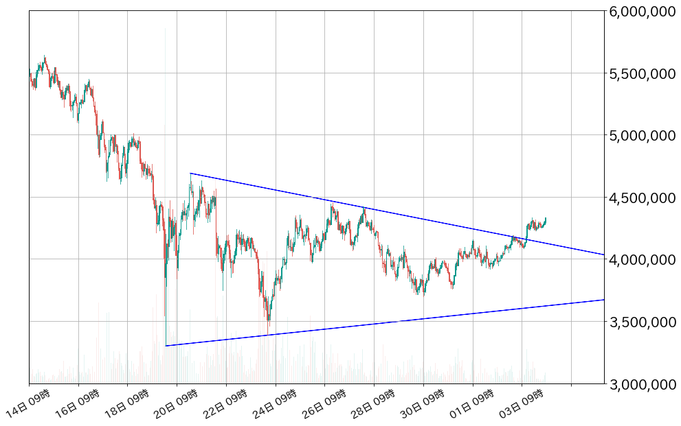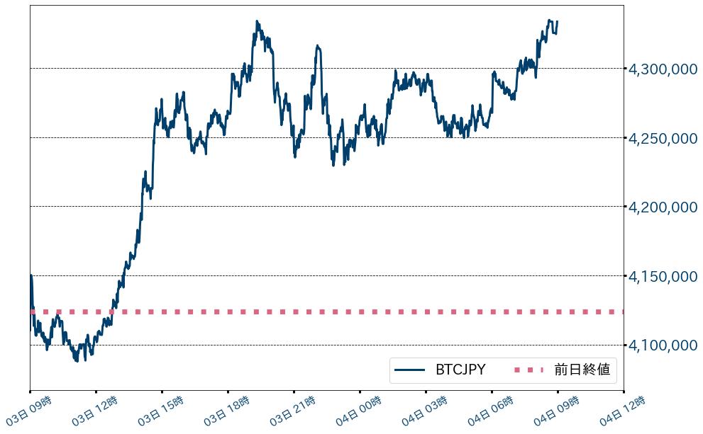 3日のビットコイン(BTC)対円相場は209,811円(5.09%)高の4,333,706円と続伸し、5月27日ぶりに終値で430万円を回復した。