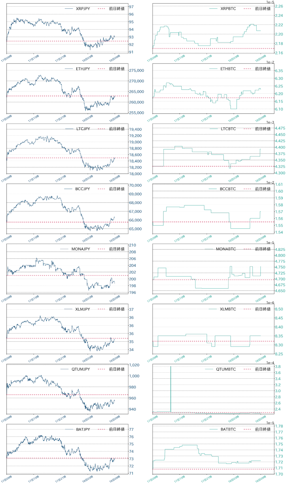 一方、欧州時間に入ると相場は一変して反落。米時間には米株の下落も相場の重石となりこの日のマイナス圏に沈んだ。ただ、相場は1時間足の200本移動平均線(≒417万円)で下げ止まり、足元、420万円台に戻している。