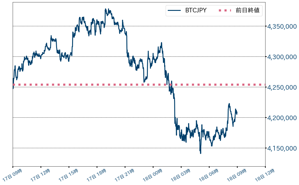17日のビットコイン(BTC)対円相場は45,632円(1.07%)安の4,208,466円と三日続落。今週は一時、200日移動平均線付近まで戻したビットコインだったが、テクニカル的な節目を背に足元では上値を重くしている。