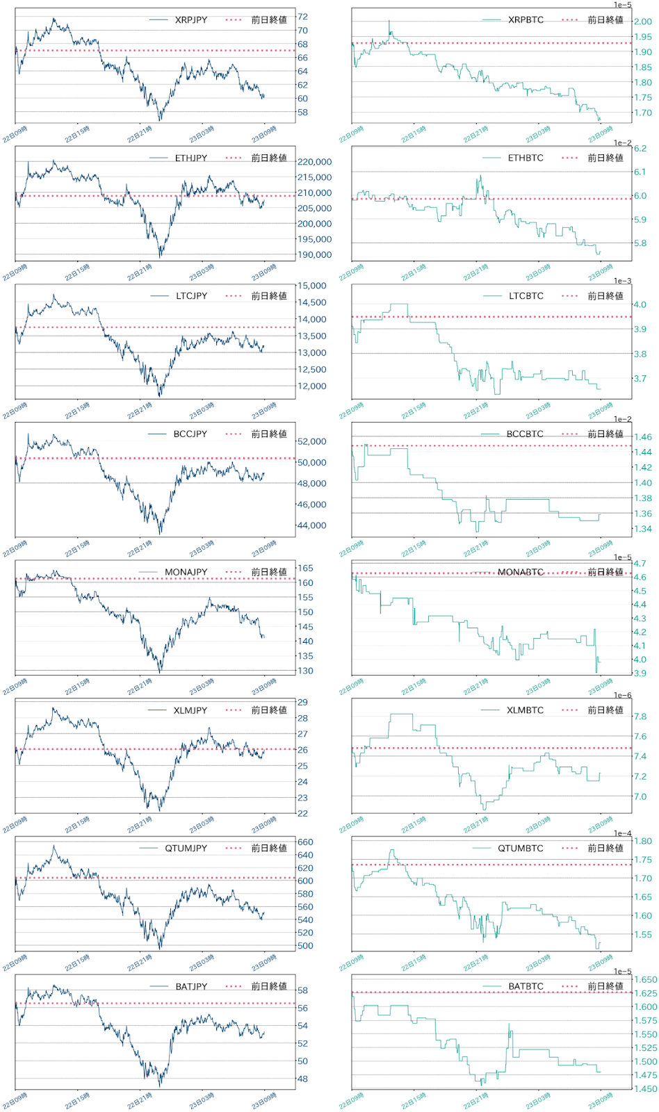東京時間のこの日の相場は、日経平均株価の大幅反発に連れ高となり360万円台後半まで戻すも、欧州時間に入るとドル高と米株先の下落に影響され上げ幅を掻き消し、アルトコイン相場が崩れるとビットコインも連れ安となり、対ドルで心理的節目の30,000ドル(≒332万円)を割り込み、365日線割れを試した。一方、米時間に入ると一変して相場は反発。この日はパウエル米連邦準備理事会(FRB)議長が下院特別小委員会の公聴会で、「インフレへの懸念だけを理由に急性な利上げをしない」と発言したことが好感され、米時間の取引でビットコインは欧州時間からの下げを一気に帳消しにした。足元では、360万円台定着をうかがう展開となっている。