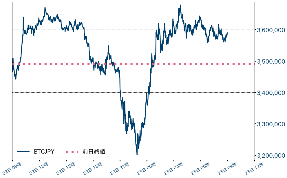 22日のビットコイン(BTC)対円相場は99,426円(2.85%)高の3,590,004円と反発。この日の相場は、一時、今年の1月28日ぶりに319万円まで押したが、365日移動平均線絡みで反発し、終値ベースでは小幅に上昇した。