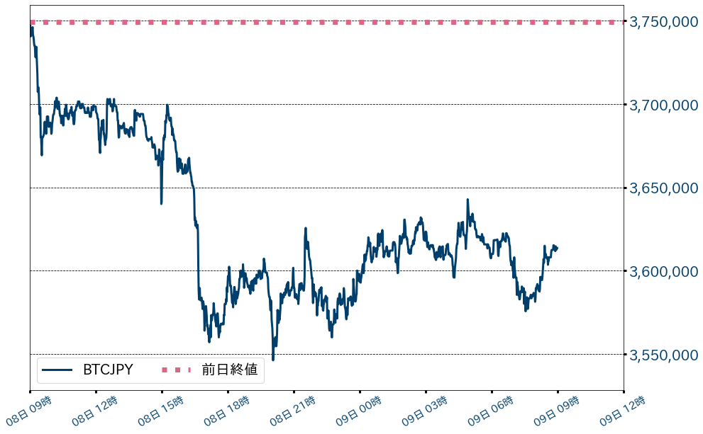 8日のビットコイン(BTC)対円相場は135,545円(3.62%)安の3,613,610円。この日はビットフィネックスでの巨額ショートポジションとマイナーからの送金の検出、さらには今週堅調に推移していたイーサ(ETH)に売りが入り、相場がほぼ棒下げ状態となったことが市場全体の重石となり、ビットコインは欧州時間までに370万円と360万円の節目を割り込んだ。米時間には、ステーブルコインの米サークルのSPAC上場計画発表を好感し下げ止まり、その後は売り一服の様相で小幅に戻したものの、33,000ドル(≒363万円)絡みで上値を重くしている。