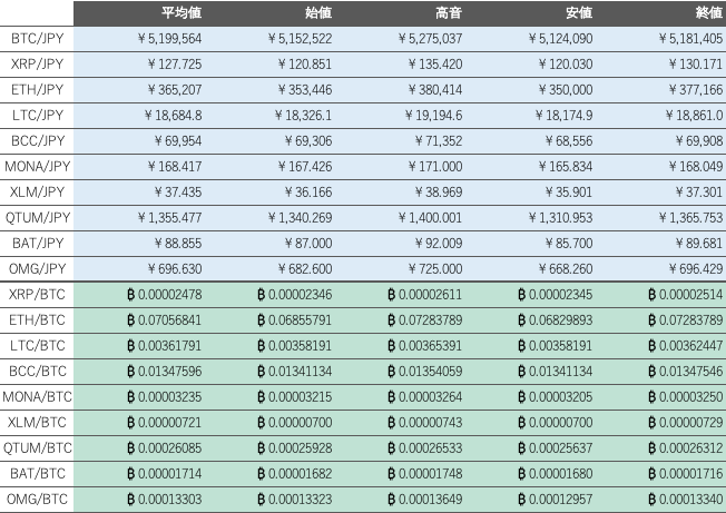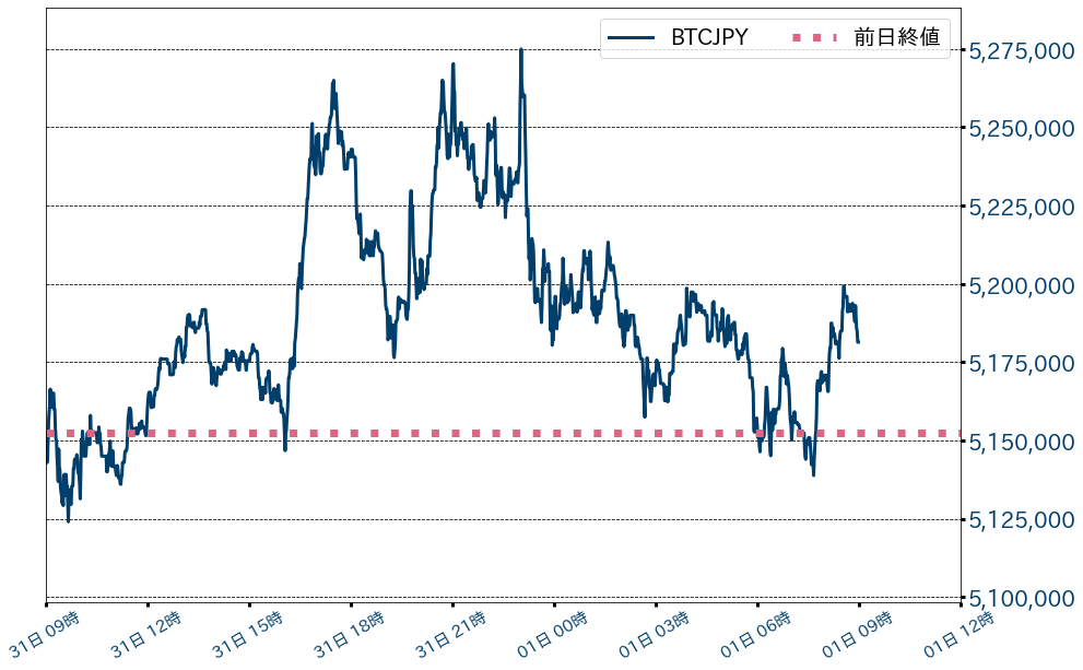 31日のビットコイン(BTC)対円相場は28,882円(0.56%)高の5,181,405円。月間では633,349円(13.93%)上昇し、2ヶ月続伸した。