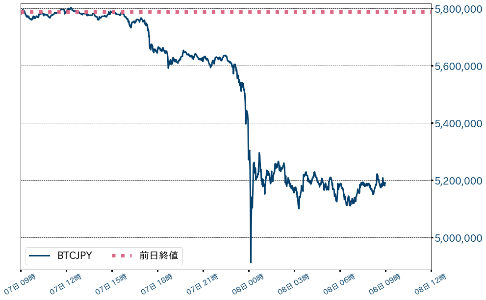 7日のビットコイン(BTC)対円相場は597,649円(10.33%)安の5,189,995円と大幅安。相場は一時、先月19日ぶりに490万円周辺まで強く押したが、終値では心理的節目の500万円や200日移動平均線(504万円)を維持した。