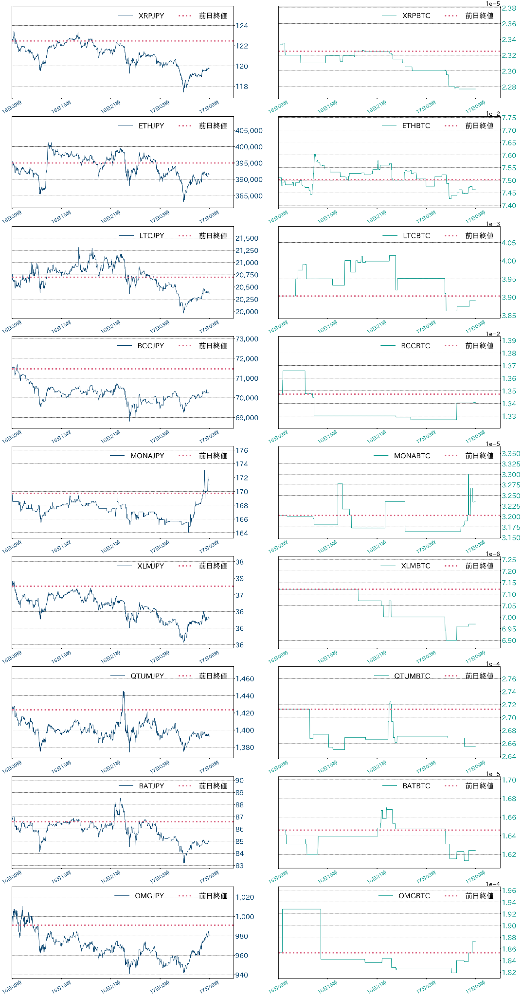 しかし、前回指摘の通り、相場は4時間足の200本移動平均線や、日足13、21、34日線が密集するエリアで上値を重くしており、来週に迫る米連邦公開市場委員会(FOMC)を前に同エリアを上抜けできるかはあまり自信がない。この先のBTCは様子見で横ばいか、警戒感からジリ安の展開となりやすいと想定している。