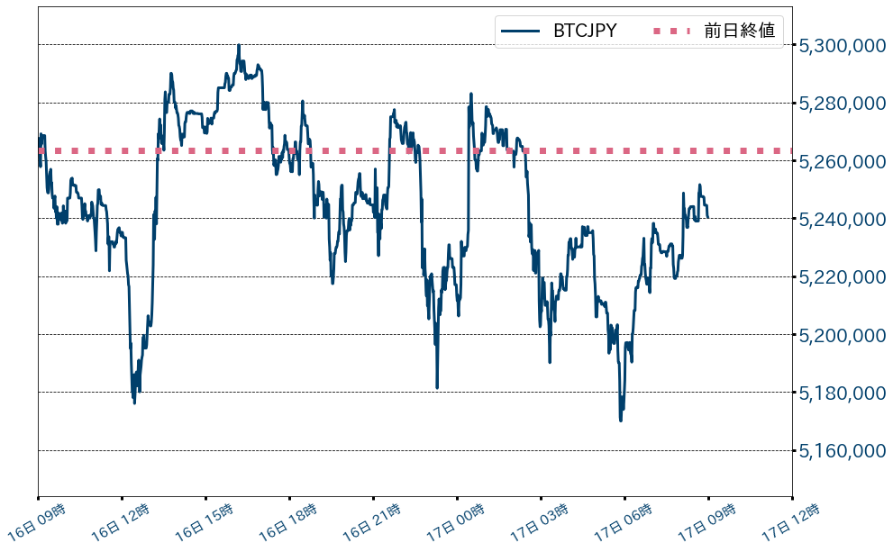 16日のビットコイン(BTC)対円相場は22,954円(0.44%)安の5,240,469円と小幅反落。テクニカル的な節目が密集する48,000ドル水準(≒526.6万円)周辺で相場は下げ渋る格好となった。