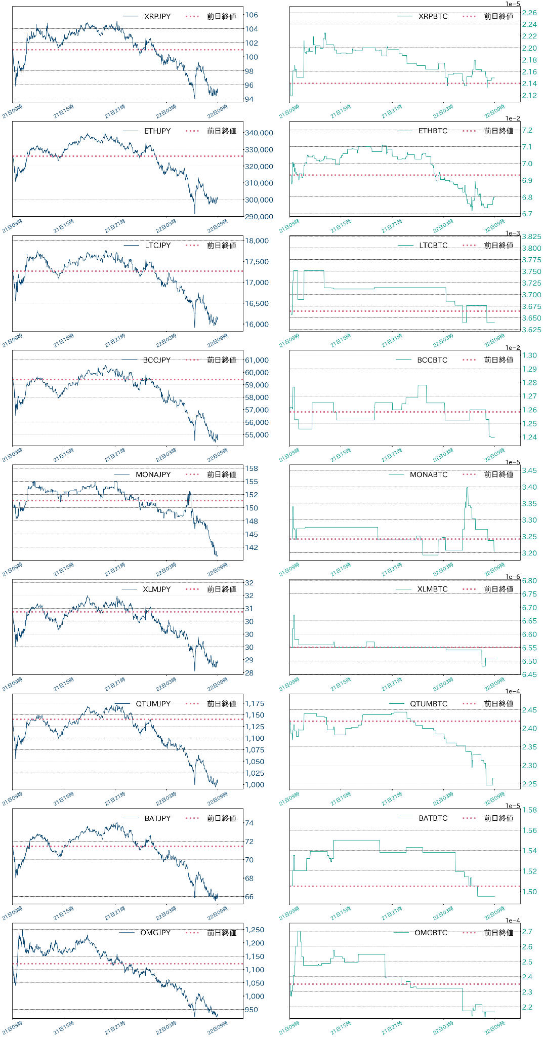 BTCは二日続けて大幅安となったが、テクニカル的には、RSIが30を割っていないことから下値余地はまだあると言え、上記の懸念も踏まえ安易に安値拾いもしにくい状況と言えよう。チャート上では、40,000ドルを終値で防衛できるかが焦点となりそうだ。底入れの場合、昨日相場のレジスタンスとなった43,000ドルの回復が条件となろう。
