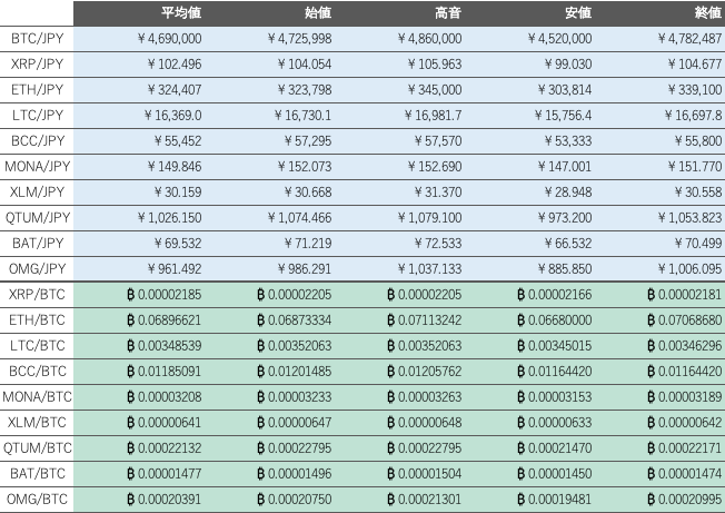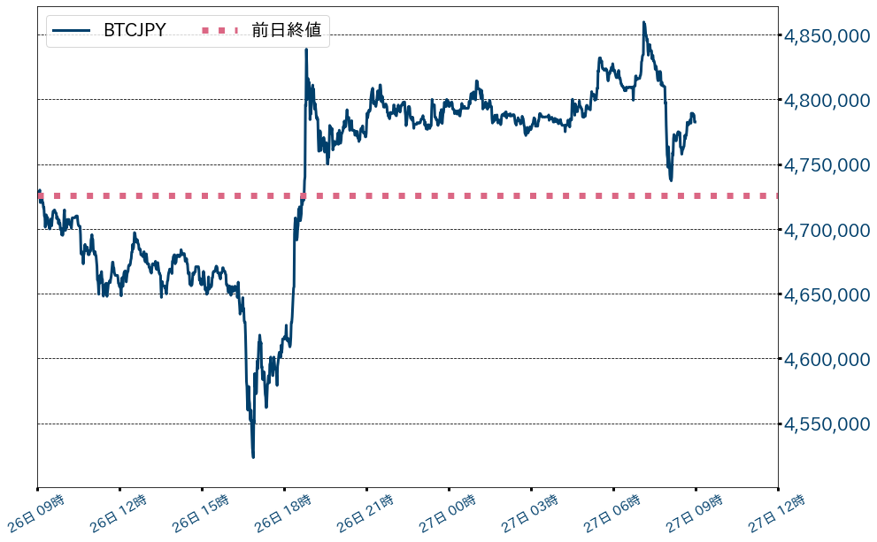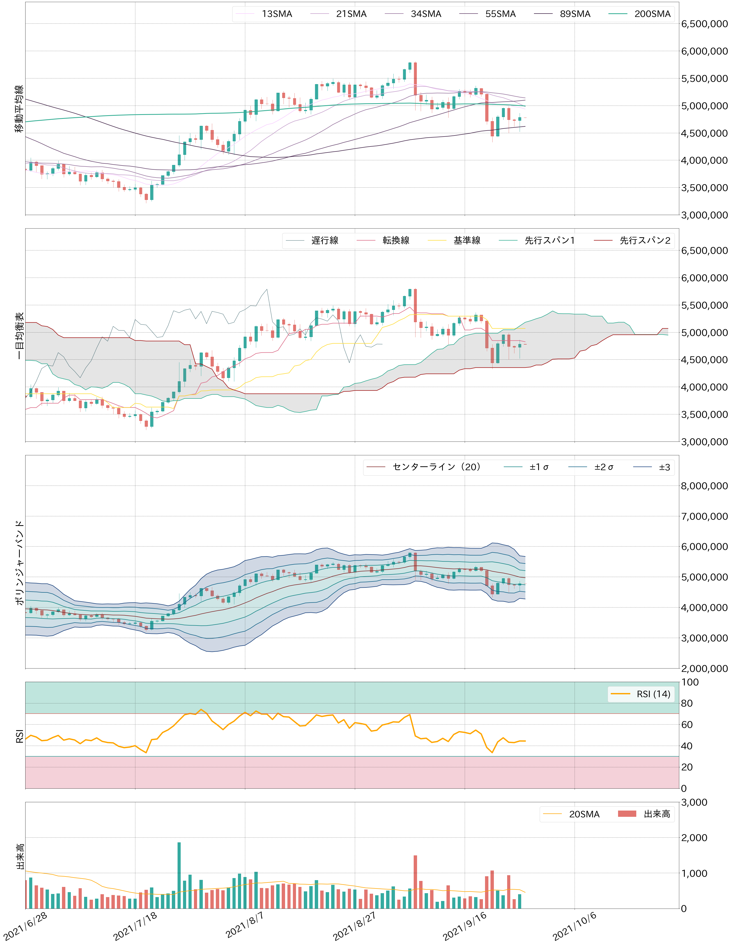 先週(20日〜26日)のビットコイン(BTC)対円相場の週足終値は、前週比424,901円(8.16%)安の4,782,487円と反落。中国恒大のデフォルトリスクで週明けに520万円周辺から430万円付近まで安値を広げた相場は、同社デフォルトリスクの後退と米連邦公開市場委員会(FOMC)を無事に通過し一時は500万円まで戻すも、24日に中国人民銀行が暗号資産(仮想通貨)の取引、マイニング及び決済の全面禁止を発表すると急反落し、450万円にタッチ。しかし、中国絡みの規制には既視感もあり、この日の相場は米株の上昇を支えに切り返し、週末にはアルトコインの上昇に連れ高となり、400万円台後半で週足終値を付けた。