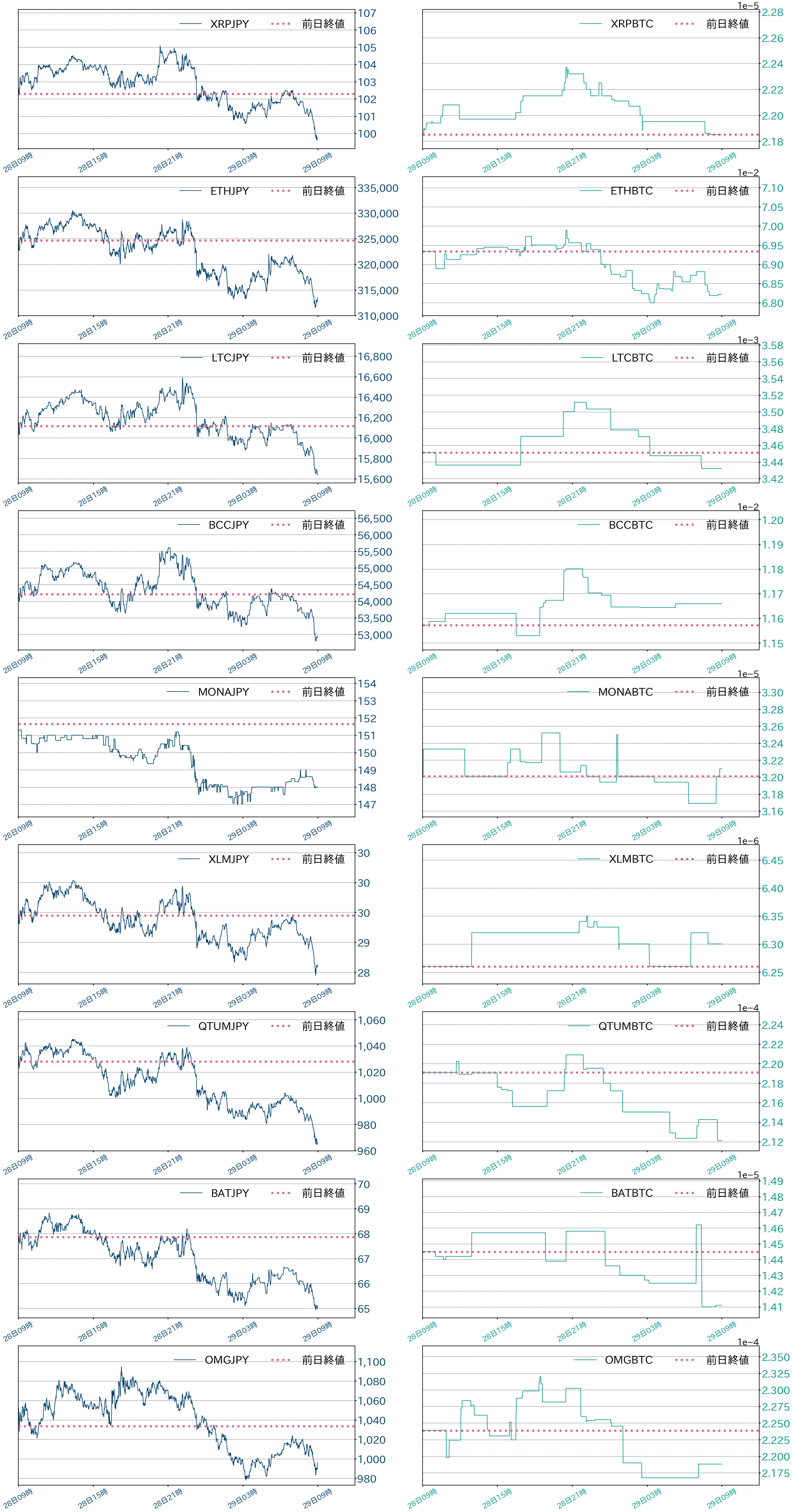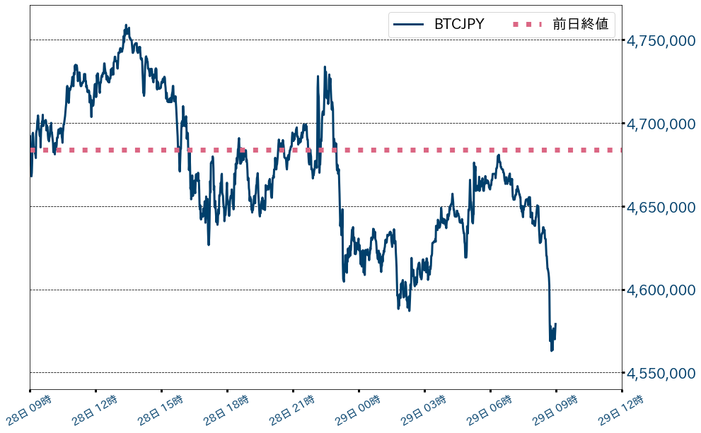 28日のビットコイン(BTC)対円相場は104,839円(2.24%)安の4,579,185円と二日続落。中国の暗号資産(仮想通貨)規制の影響が依然として広まる中、東京時間のこの日のBTCは前日終値を巡り底堅くも上値の重い展開。海外時間には、中国政府が国営企業に中国恒大の資産を購入するよう要請しているとの報道で反発する場面もあったが、米国の債務上限適用停止法案が採決阻止されたことを嫌気し長期金利が上昇し株価は下落。仮想通貨にもリスクオフは波及し、BTCは460万円まで一段安。その後は米株が下げ止まるのを眺めジリ高となったが、42,000ドル(≒468万円)がレジスタンスとなり、今朝方に460万円も割り込んだ。