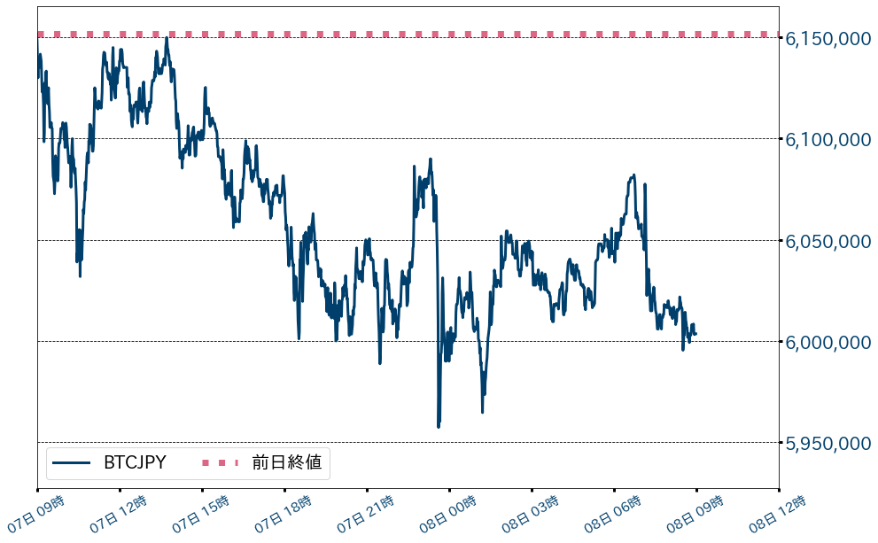 7日のビットコイン(BTC)対円相場は148,210円(2.41%)安の6,003,577円と反落し、5日続伸とはならなかった。