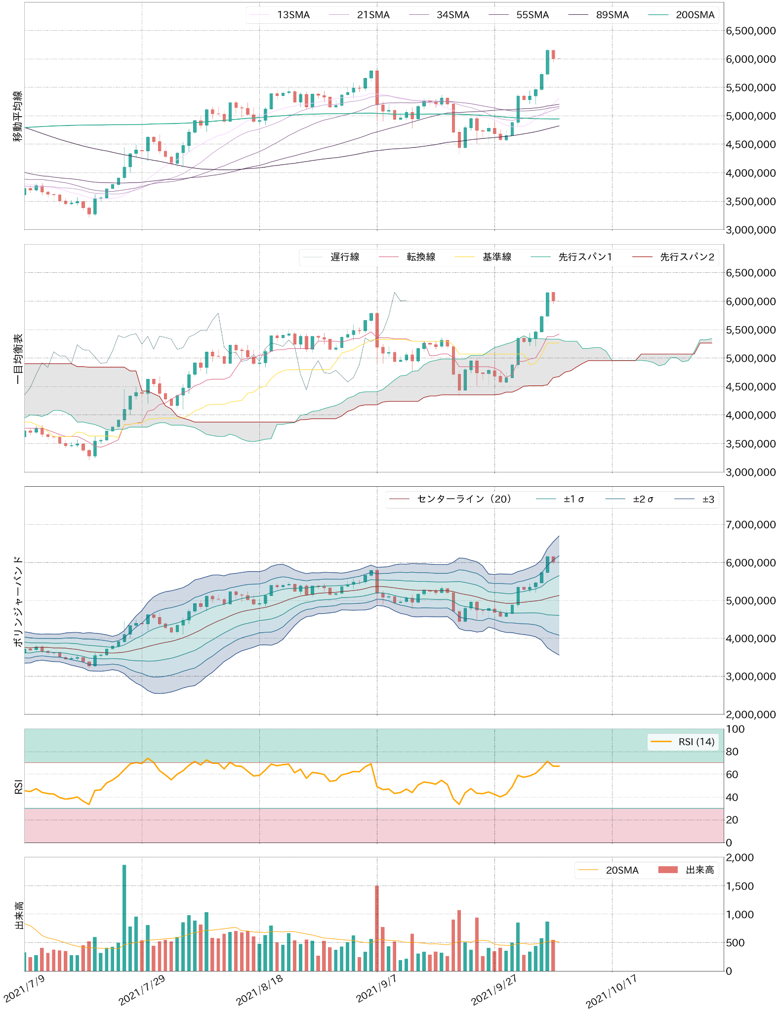 前日の相場上昇を受け東京時間のこの日の相場は利益を確定する動きが見られたものの、54,000ドル(≒602万円)絡みで相場は買い支えられ底堅い展開となったが、終盤に差し掛かるとアルトターン気味にジリ安に転じ、海外時間には54,000ドルを割り込んだ。米時間序盤には高寄した米株に一時連れ高となるも、米株が上げ止まるとBTCは608万円絡みで戻り売りが入り反落。その後は、米上院与野党が年末までの債務上限引き上げに合意したことや、JPモルガンの機関投資家がインフレヘッジ資産として金(ゴールド)よりもBTCに関心を寄せているというノートを好感して下げ止まり、今朝方には54,000ドルを回復。しかし、608万円周辺で相場は再び反落し、終値での54,000ドル維持とはならなかった。