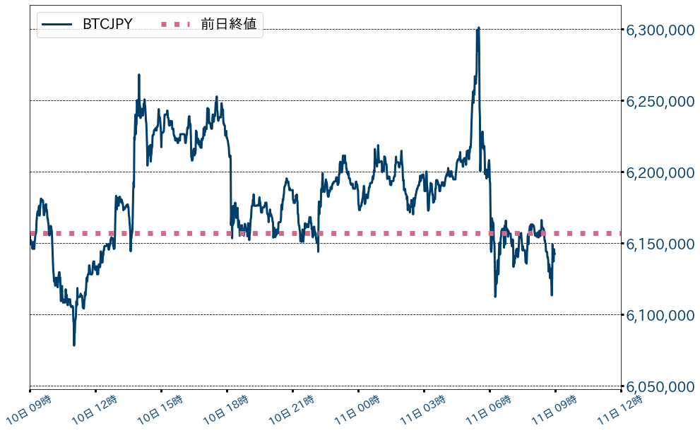 米国の期待インフレ(BEI)上昇やビットコイン上場投資信託(ETF)の承認期待が高まる中、8日金曜日のBTC相場は620万円台後半に乗せ、対ドルでは56,000ドルにタッチした。しかし、この日の夜の米雇用統計発表を控え警戒感もあったか、相場はその後反落。雇用統計は市場予想が50万人前後の非農業部門雇用者数の増加に対し、わずか19.4万人との結果になり、景気回復への懸念が株価の重石となると、BTCは620万円を割り込み604万円(≒54,000ドル)周辺まで下落した。