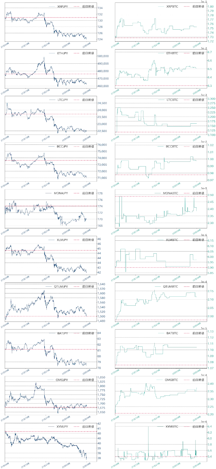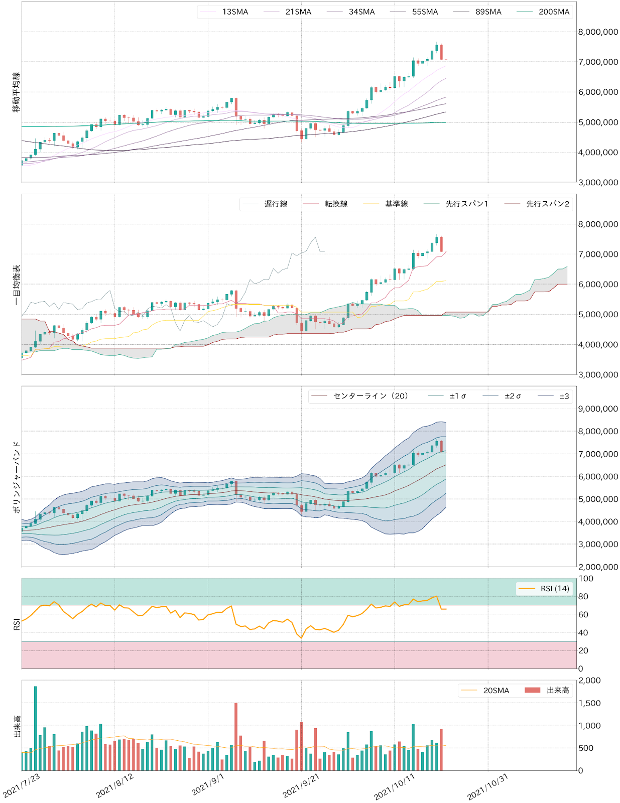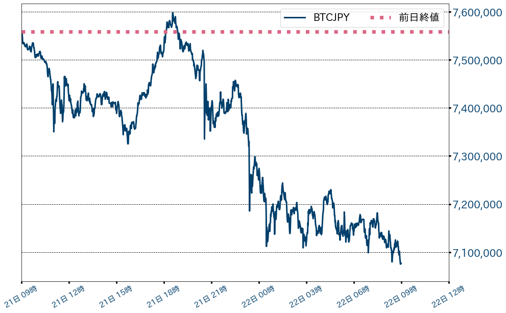 21日のビットコイン(BTC)対円相場は481,938円(6.38%)安の7,076,995円と反落。前日には対ドルでも史上最高値を更新したBTCだったが、東京時間のこの日の相場は上昇一服で利益確定の売りが優勢となり、750万円台中盤から前日の上げ幅を縮小させた。終盤に差し掛かり相場が前日の上げ幅を完全に掻き消すと、64,000ドル近辺(≒732万円)から押し目買いの様相で反発するも、アルトターン気味に上値を抑えられた末、Binance USでBTC対ドルが8,200ドルまでフラッシュクラッシュを起こしたことが嫌気され反落。米時間には、ProSharesのBitcoin Strategy ETF(BITO)が大幅安で始まったこともあり一段と売りが膨らみ、相場は64,000ドル水準を割り込んだが、62,000ドル(≒707万円)絡みで下げ止まっている。