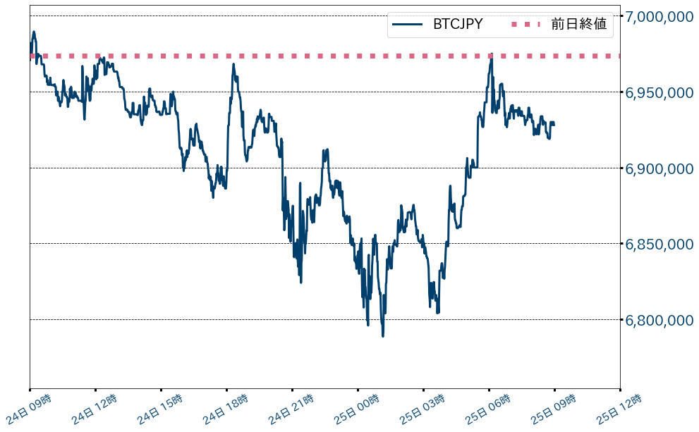 先週(18日〜25日)のビットコイン(BTC)対円相場の週足終値は、前週比104,115円(1.48%)安の6,928,000円と4週ぶりに反落。