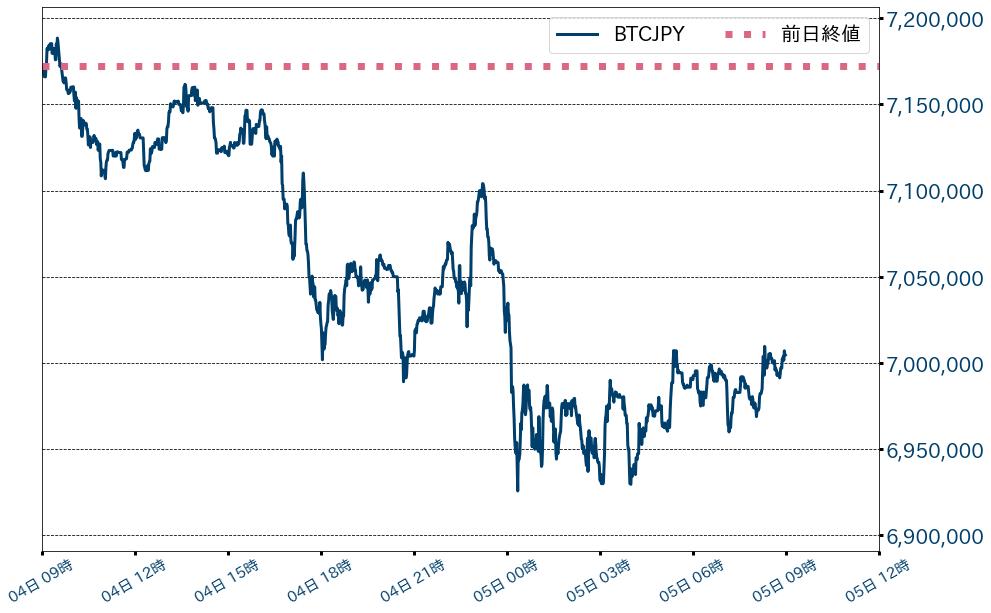 4日のビットコイン(BTC)対円相場は167,749円(2.34%)安の7,004,633円と2日続落し、節目700万円からの上放れに失敗した。