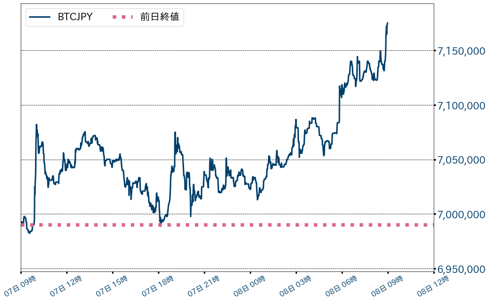 先週(1日〜7日)のビットコイン(BTC)対円相場の週足終値は、前週比162,583円(2.32%)高の7,174,984円と小幅ながら2週続伸。対ドル週足では、4週連続で節目の60,000ドル(≒681万円)を終値ベースで維持した。