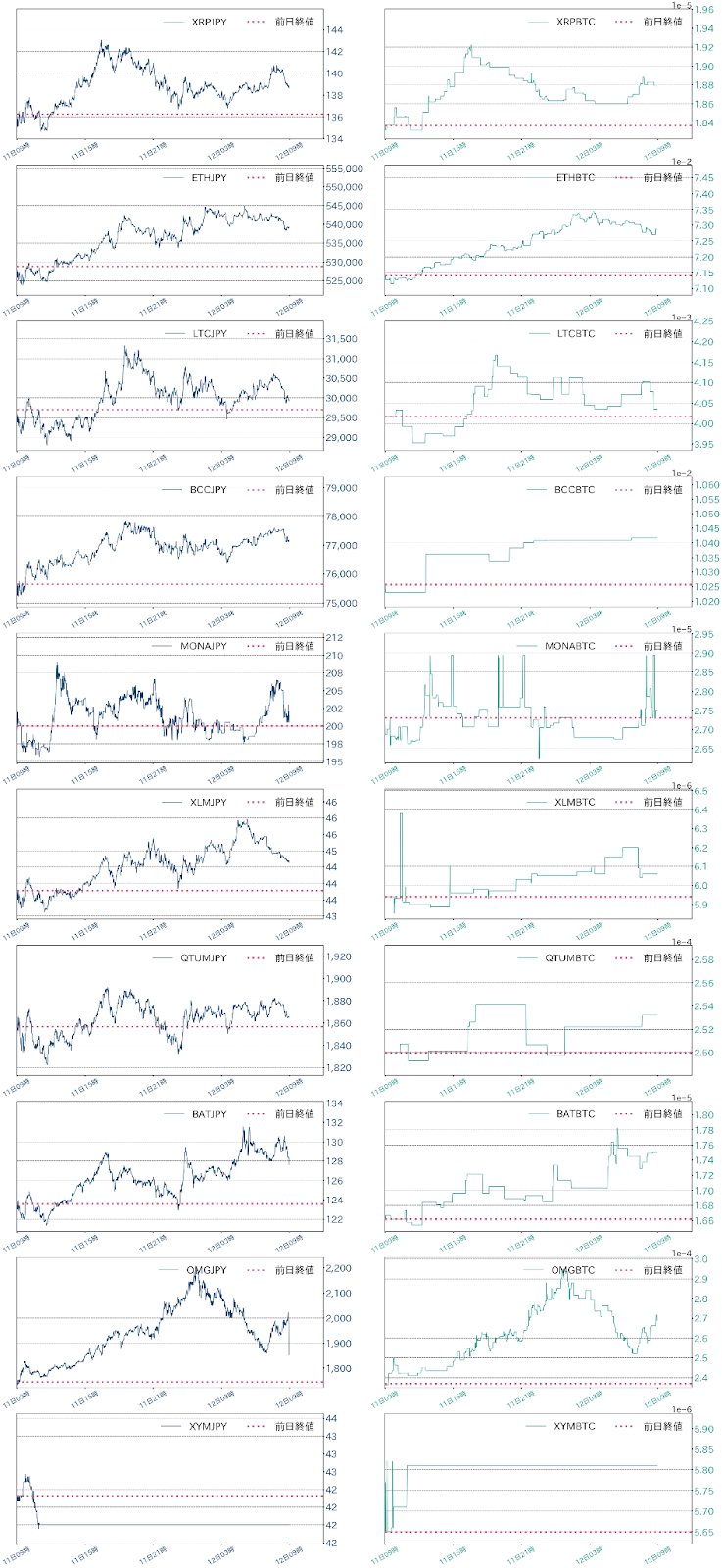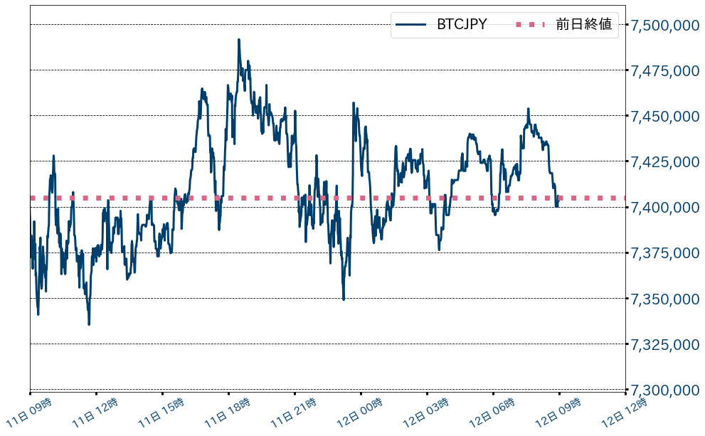11日のビットコイン(BTC)対円相場は1,581円(0.02%)安の7,403,419円とほぼ変わらず。前日の下落から一段楽し、相場は下げ止まった。