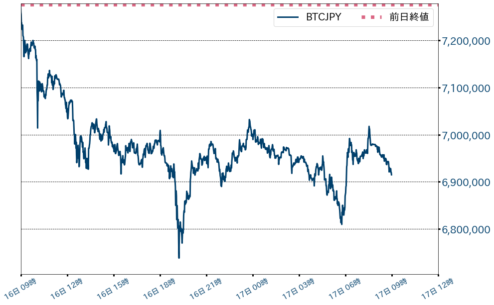16日のビットコイン(BTC)対円相場は361,090円(4.96%)安の6,915,002円と2日続落し、対ドルでは60,000ドル近辺に終値を付けた。