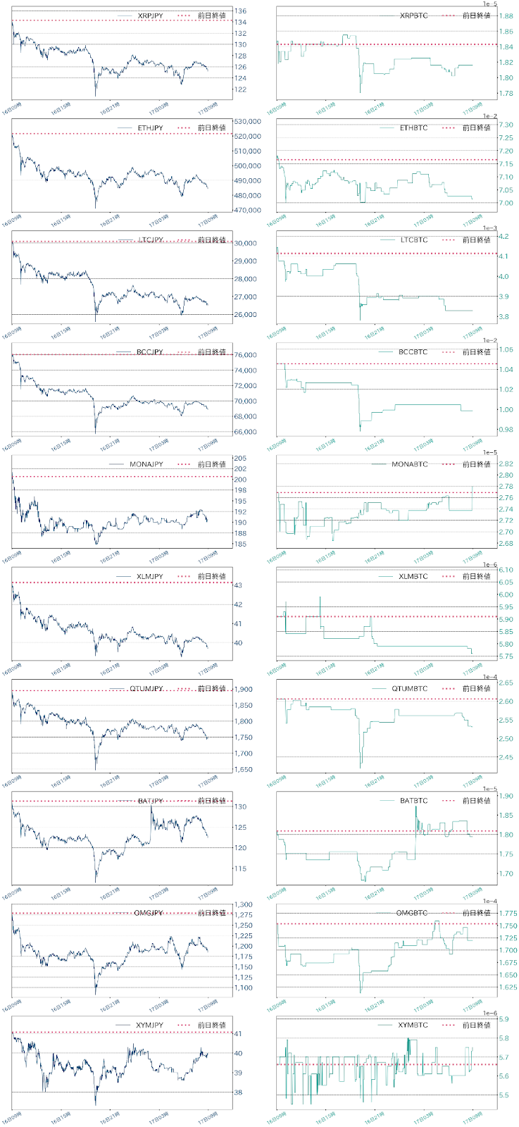 週明け東京時間のBTCは750万円を挟み込み揉み合いに終始したが、ナスダック上場のマイニング企業、Marathon Degital(MARA)が米証券取引委員会(SEC)から召喚状を受けたと明かすと、同社株価は大きくギャップダウンして取引を開始し、その後も安値を広げる展開となり、他の仮想通貨(暗号資産)マイニング企業株とBTC相場を道連れにした。これによりBTCは保ち合い下放れとなり、720万円台後半まで押すと、1兆ドル規模の米インフラ法にバイデン大統領が署名したことも相場に追い討ちをかけ、15日のBTCは対ドルで64,000ドル(≒735.5万円)を割り込んだ。これにより、16日東京時間のBTC相場はポジション調整的な売りも重なり下げ足を速め、欧州序盤にはおよそ3週間ぶりに58,500ドル(≒672万円)近辺まで押した。その後は押し目買いの様相で下げ止まるも、節目の61,000ドル(≒701万円)周辺が相場のレジスタンスとなると、マイニング株の続落も相場の重石となり、戻りは鈍かった。