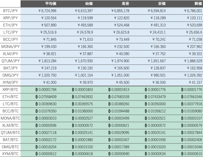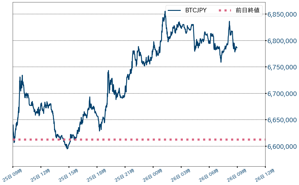 26日のビットコイン(BTC)対円相場は173,756円(2.63%)高の6,786,001円と反発し、週足ではプラス圏に浮上した。