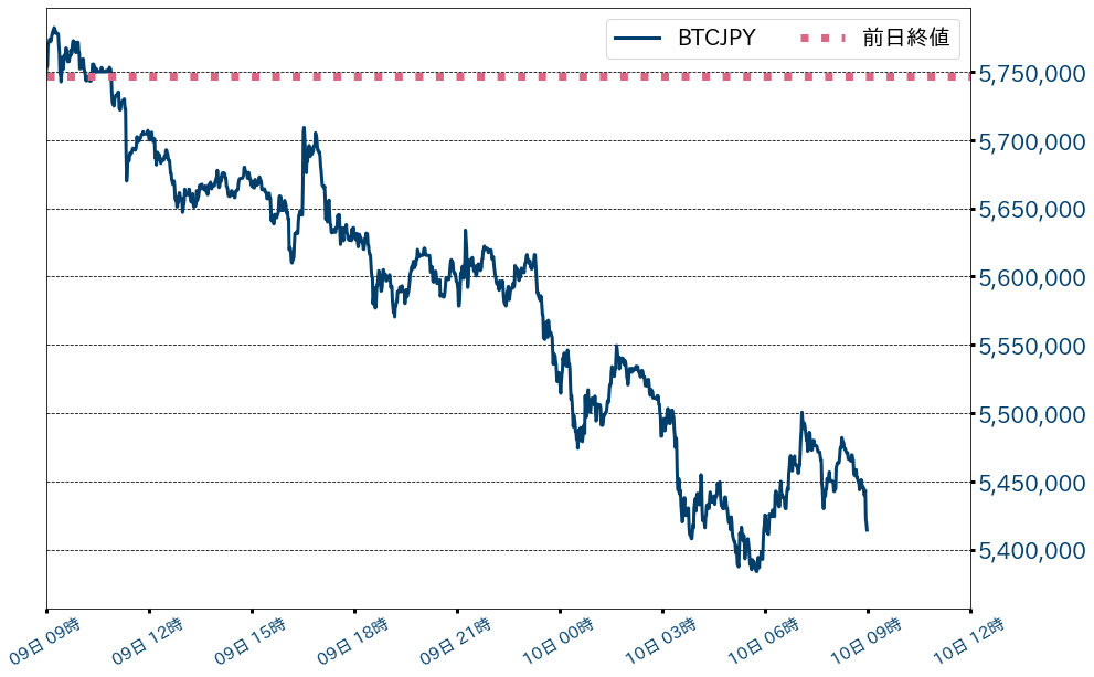 9日のビットコイン(BTC)対円相場は332,653円(5.79%)安の5,414,329円。対ドルで節目50,000ドル(≒567万円)を巡る攻防は弱気筋に軍配が上がり、相場は直近安値の下抜けを試す展開となっている。