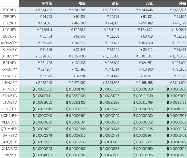 先週(6日〜12日)のビットコイン(BTC)対円相場の週足終値は、前週比99,505円(1.78%)高の5,699,505円と小幅に反発し、3週続落を回避し下げ止まった。