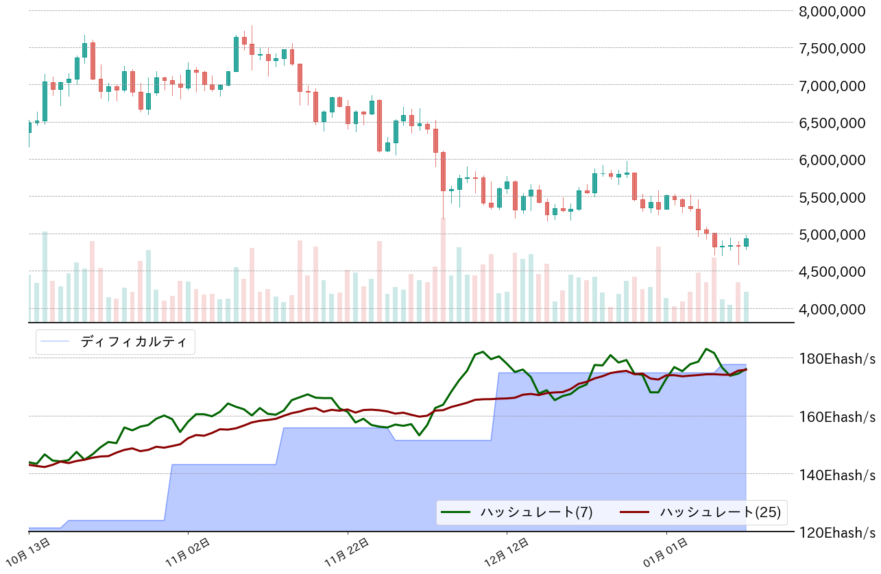 本邦が3連休最終日となった週明け10日の米市場で、BTCは一時的に40,000ドル(461.2万円)を昨年9月ぶりに割り込んだが、節目を割り込んだことで安値拾いの買いが入った他、米株の反発も相場の味方となり同水準を即座に回復し480万円台まで戻すと、11日東京時間にはジリ高を演じ490万円にタッチした。