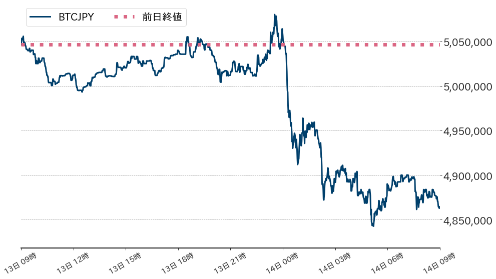 13日のビットコイン(BTC)対円相場は182,015円(3.61%)安の4,864,310円と反落し、前日の上げ幅を解消した。
