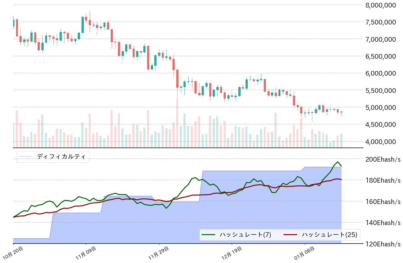 18日のビットコイン(BTC)対円相場は8,842円(0.18%)高の4,858,842円と小幅に反発。短期では方向感に欠ける展開が続いている。