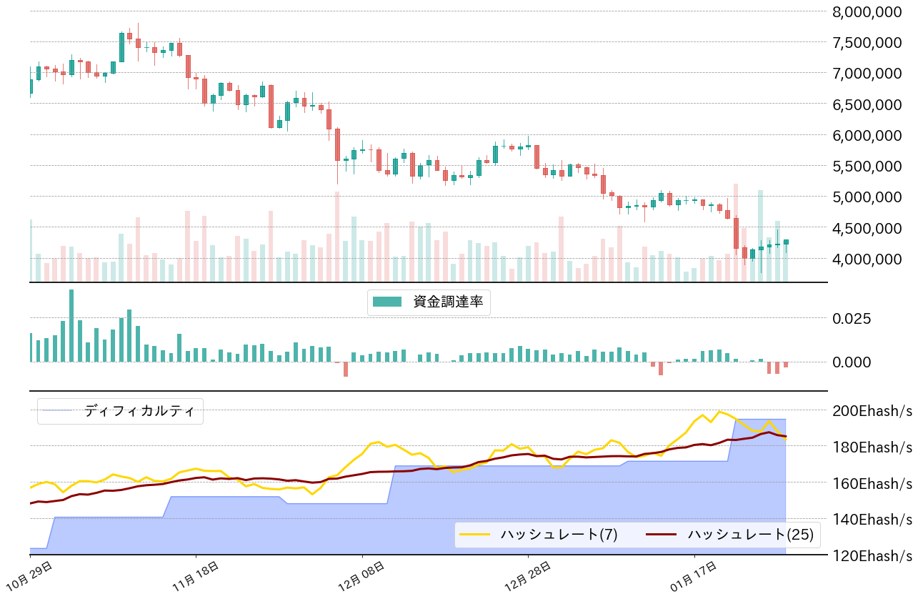 ただ、ジリジリと戻す展開が続き、資金調達率も継続的にマイナスに振れていることから(ショートポジションの積み上がりを示唆)、目先の話ではあるが、構造的な相場の反発が起きる可能性もある。昨日の相場は短くダブルボトムを形成しているということもあり、ネックライン(430万円)の上抜けで直近高値の445万円を試す展開も視野に入る。