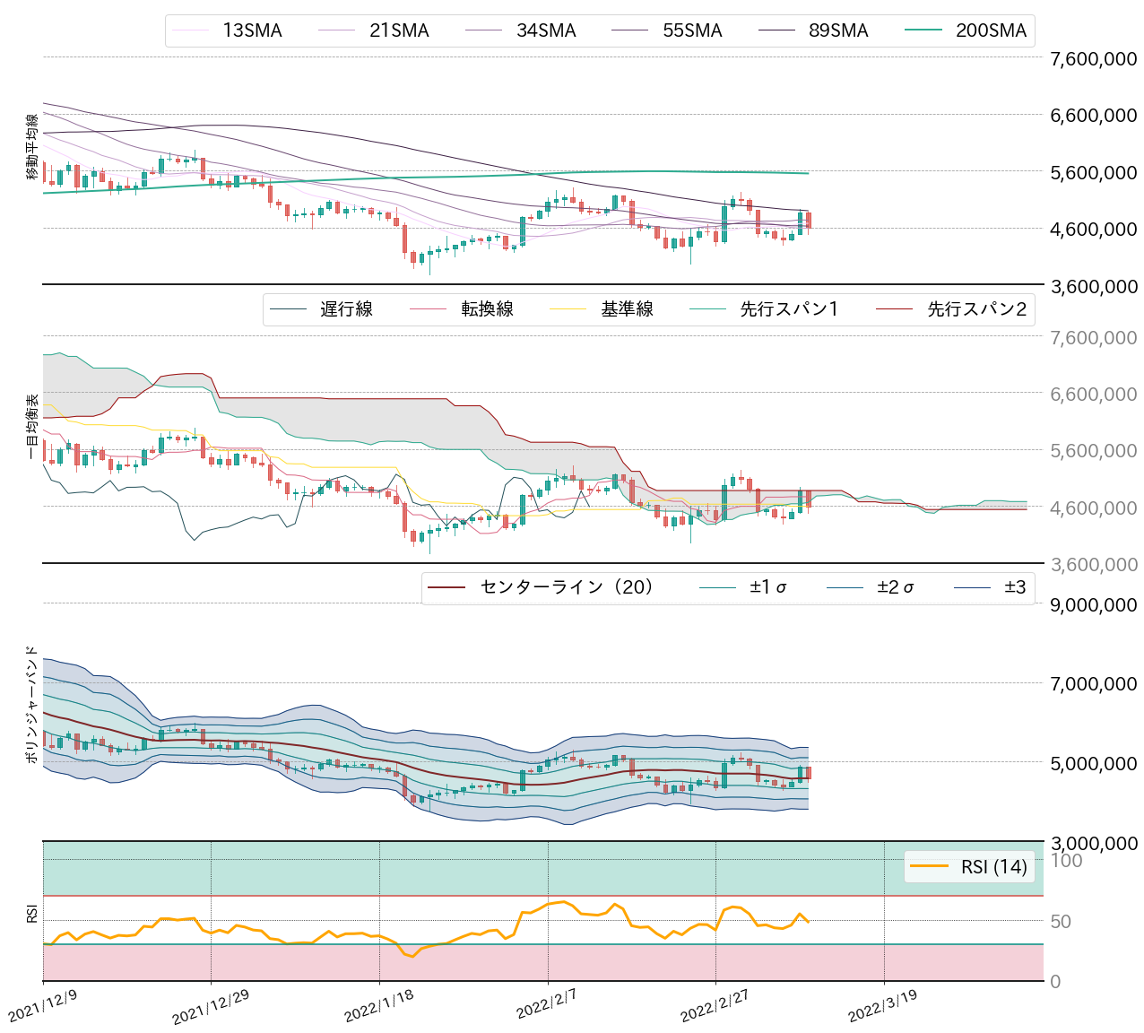その後のBTCは、9日の急伸まで相場の短期レジスタンスとなっていた450万円周辺のエリアで下げ止まると、2月米消費者物価指数(CPI)の7.5%から7.9%への加速を受け、インフレヘッジとして一時10万円ほど上昇するも、米株先の反落を受けて20万円ほど急反落し、450万円をわずかに割り込む乱高下を演じた。しかし、その後は米主要3指数が反落する中、BTCは450万円台中盤まで戻し、米市場後半に株価が切り返すと連れ高となり460万円にタッチ。足元では、対ドルで1月22日安値(39,650ドル)となる同水準がレジスタンスとなっている。
