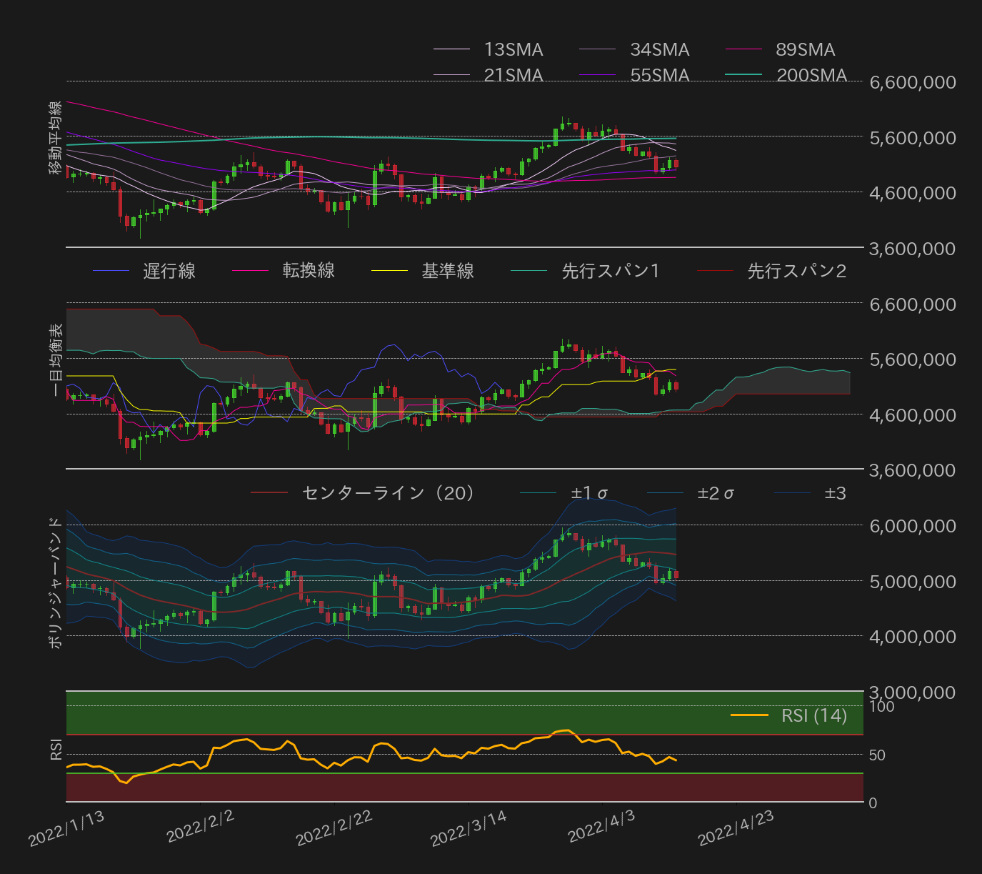 いずれにせよ、本日から欧米はイースターの休日に入ることから、18日週明けのシカゴマーケンタイル取引所のBTC先物取引開始(午前7時)まで閑散相場で動意薄となりやすいか。押し目買いで反発しても、41,000ドル水準の518万円や、ボリンジャーバンドの-1σ(516万円)などの上値目途が目先のレジスタンスとなりそうだ。