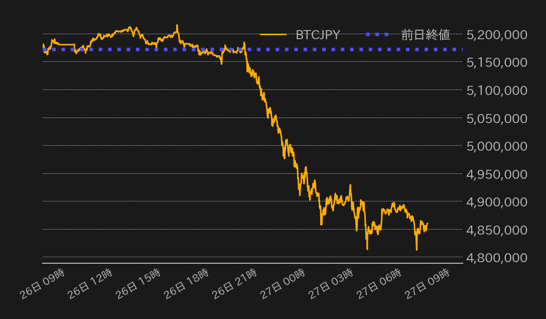 26日のビットコイン(BTC)対円相場は312,236円(6.04%)安の4,859,740円と大幅安。今月11日ぶりに終値で節目の500万円を割り込んだ。