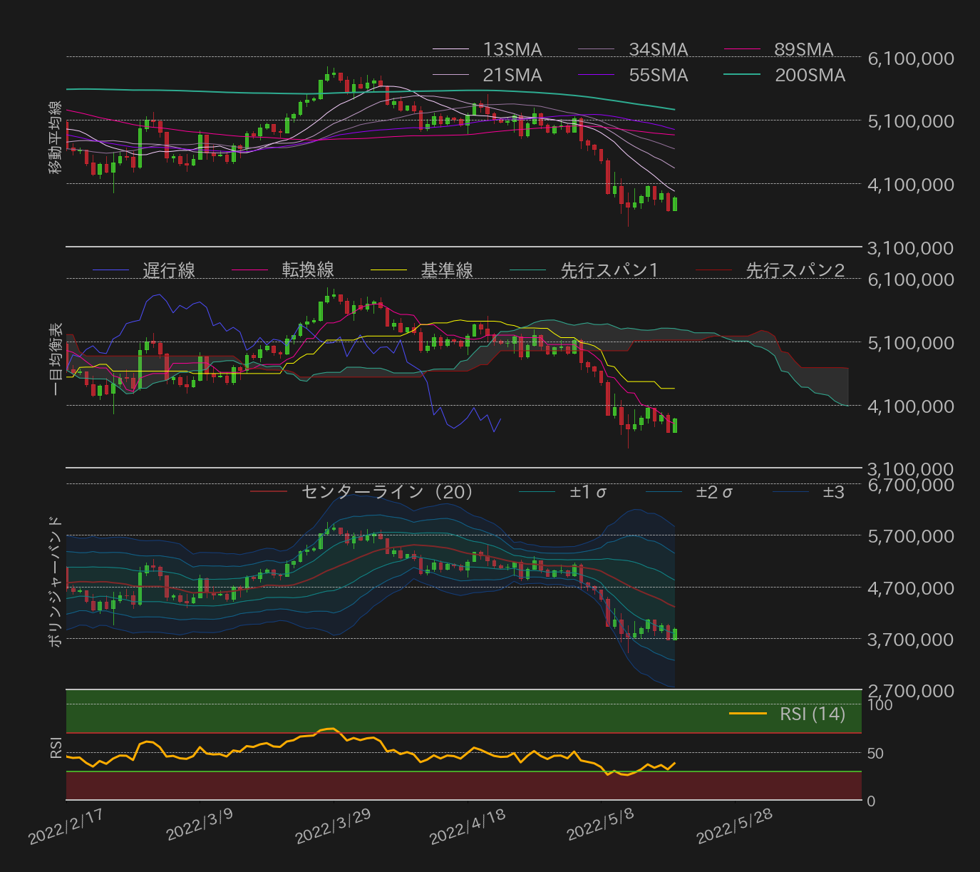 米小売TargetやWalmartの業績不振を受けた一般消費財と生活必需品セクターの強い下げが18日の株式市場急反落の引き金となり、BTCは30,000ドル水準となる383万円周辺での揉み合いから下抜けを演じ、360万円中盤まで押したが、対ドルで昨年安値となる同水準で下げ止まると、19日の東京時間は揉み合いに終始し重要なチャートの節目を維持した。