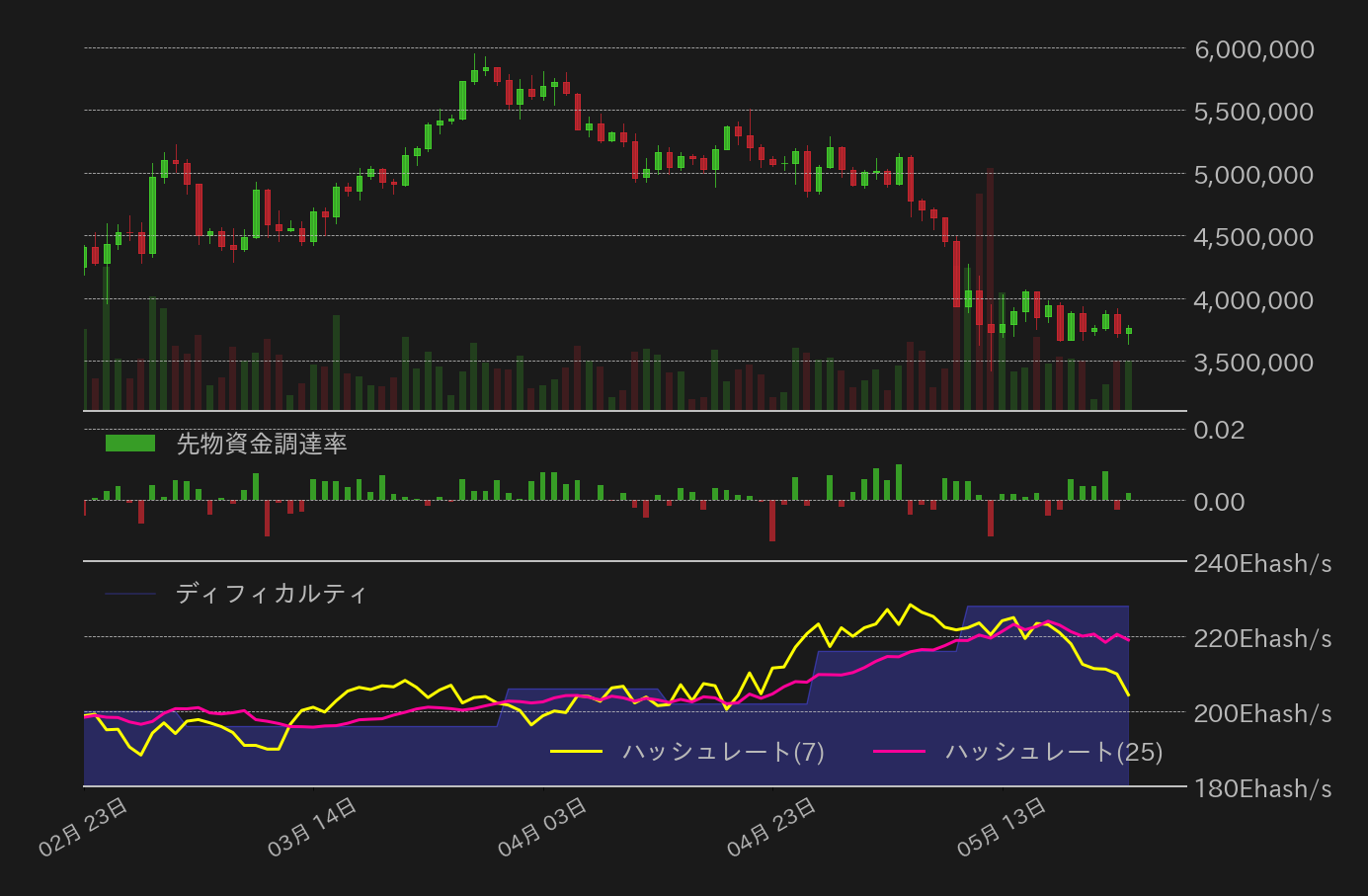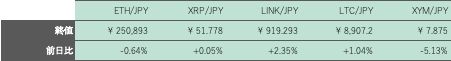 ピザデーの祝賀ムードが広がる中、週末に反発し380万円を回復したBTCの対円は、週明けも日経平均や米株先物の上昇を追い風に底堅く推移するも、決定的な材料に乏しくジリ高となると、テクニカル的に下落パターンである上昇ウェッジを形成。この日は米株が下げ一服で反発するも、米時間のBTCは綺麗にウェッジ下抜けとなり週末の上げ幅を帳消しにした。