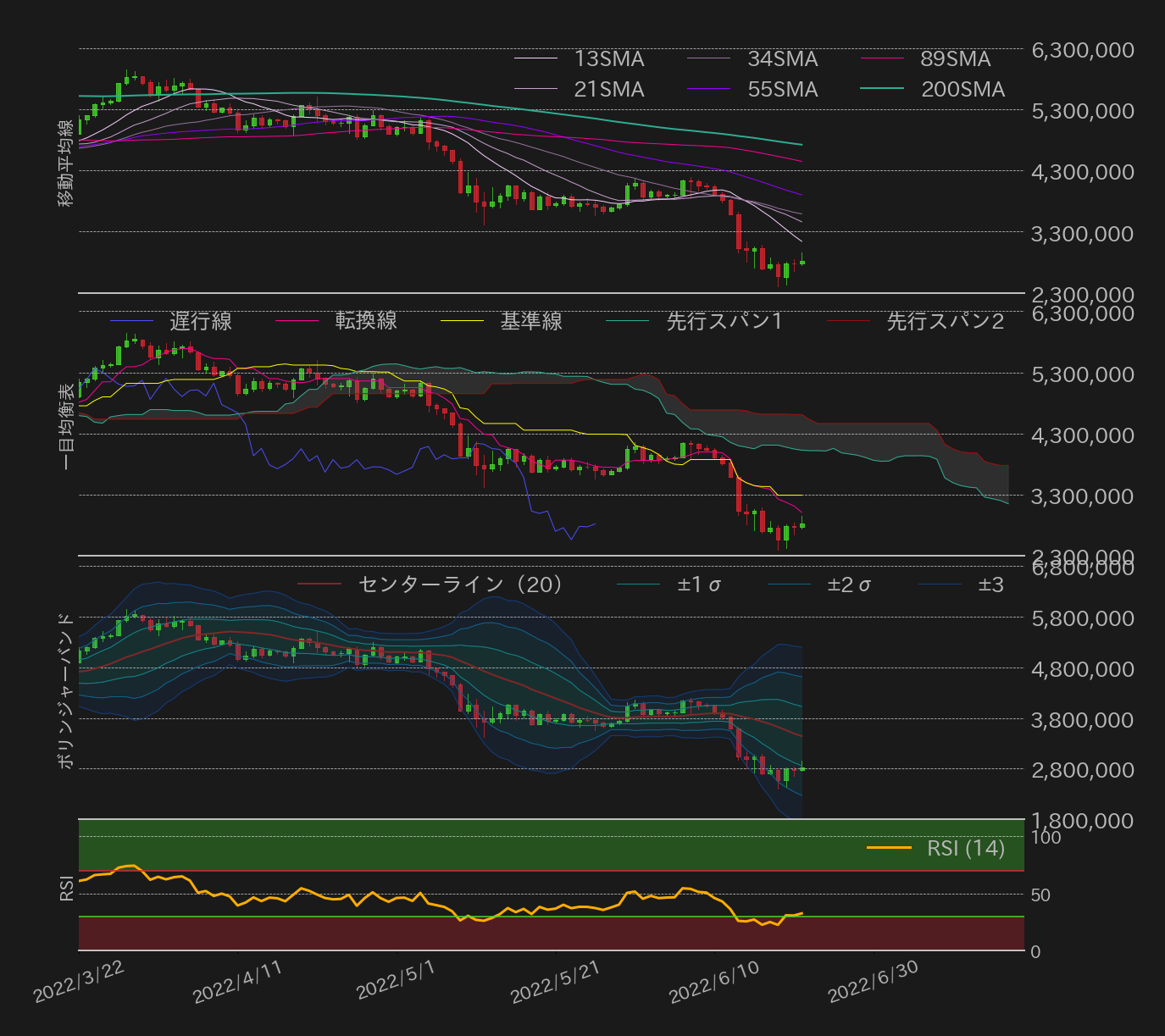 週末の18,000ドル(≒243万円)割れから売り一巡の様相で反発したBTC相場だったが、週明けには21,000ドル水準となる284万円周辺で上値を抑えられ失速。しかし、顧客資産引き出し停止で渦中のCelsiusのCELトークンに、ショートスクイーズ誘発を故意に狙った買いが入りCEL相場が急上昇すると、BTCも連れ高隣284万円の突破に成功。また、昨日は米株先物の反発と円の下落も追い風となり、相場は296万円近辺まで上昇した。