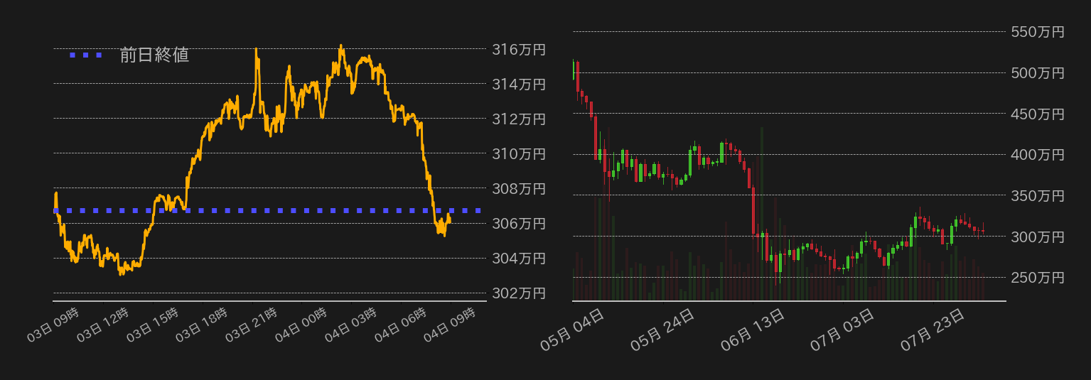 3日のビットコイン(BTC)対円は、複数のソラナ(SOL)系ウォレットへのハッキングによる不正流出が報じられる中、対ドルで200週線の走る22,873ドル(≒306.6万円)を割り込むも、対ドル相場が前日安値でサポートされダブルボトムを打つと上昇に転じた。ただ、直近数日間でBTC相場のレジスタンスとなっている23,500ドル水準の315万円周辺で上値を抑えられると、元中国系で現在スイスに拠点を置く暗号資産(仮想通貨)取引、ZB.comがハッキングを理由に顧客の入出金を停止したとの報道が今朝方転がり込み、BTCは急反落を演じ上げ幅を解消、終値は小幅に下げ6日続落となった。