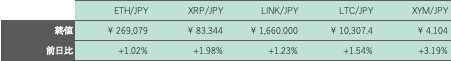 BTCは引き続き高値揉み合いとなっており、23日の相場急伸から日柄調整が続く格好となっている。テクニカル的には、相対力指数(RSI)が「買われ過ぎ」水準とされる70%を超えた状態が続いている一方、ボリンジャーバンドでは相場が+1σと+2σの間に入っており、僅かながら過熱感が後退したと言える。また、バンド幅は拡大し上昇トレンドのシグナルとなる上昇バンドウォークの発生が指摘され、相場が+1σを割るまで不用意な逆張りには引き続き注意したい。