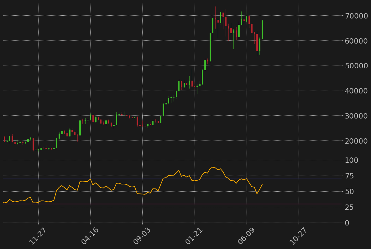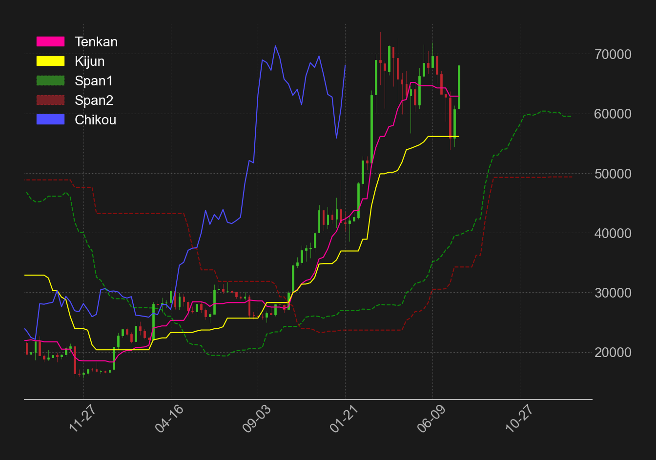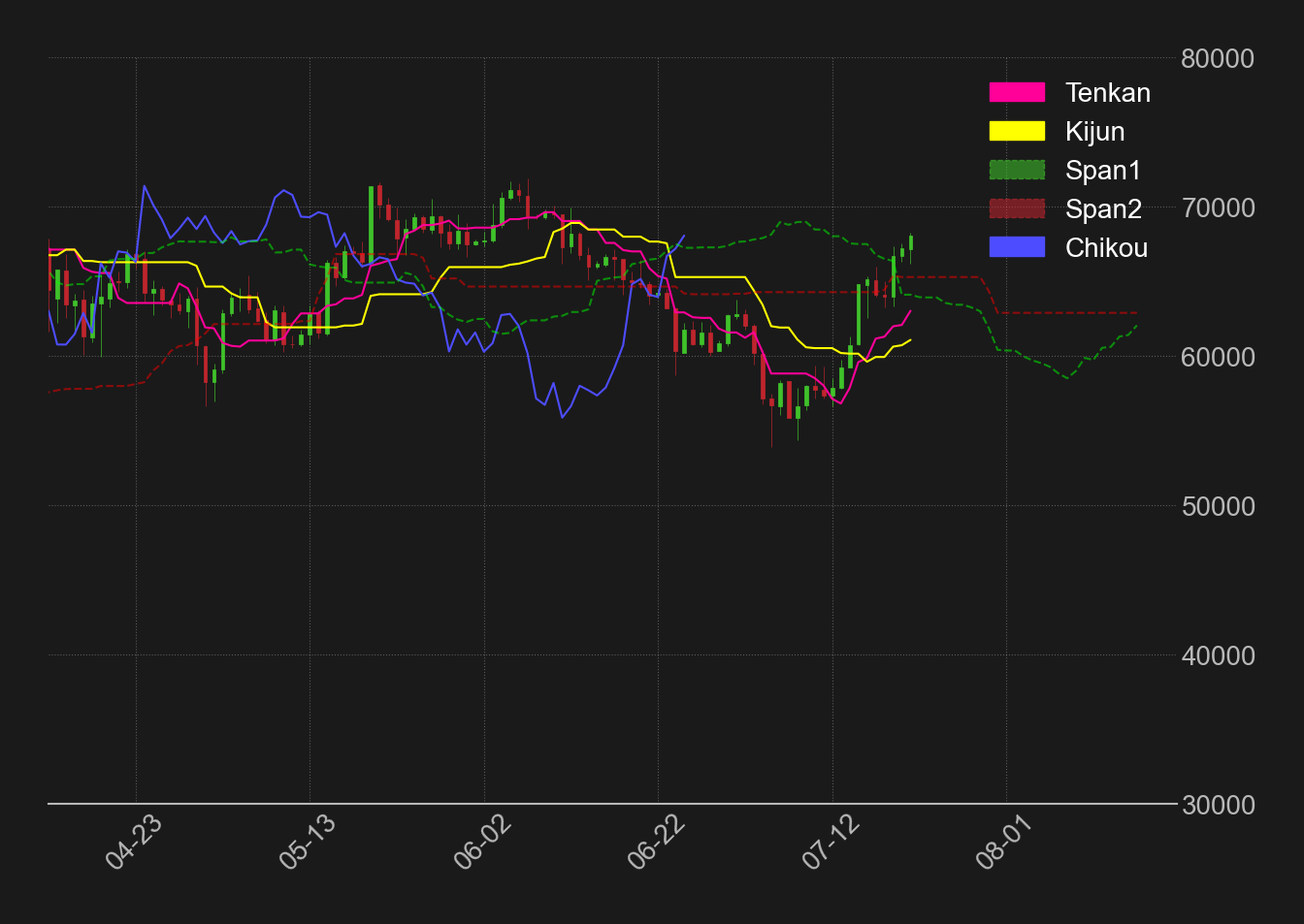 2週間前には、日足RSIが売られ過ぎ水準の30%割れ目前となっており、当時200日線や日足一目均衡表の転換線が密集した58,000ドル台後半への相場の揺り戻しを指摘したが、相場は同エリアを上抜け、先週には68,000ドルを回復した。