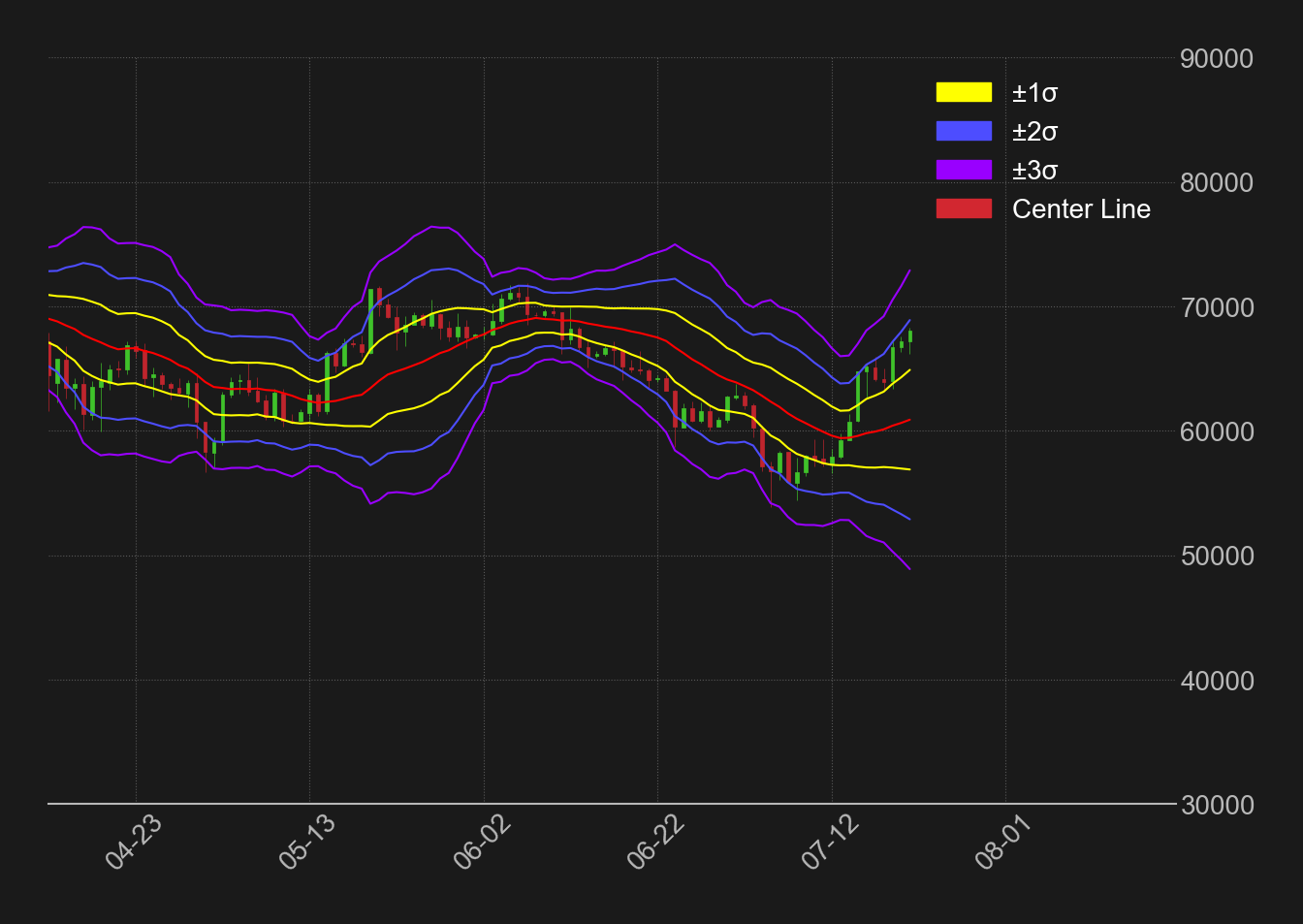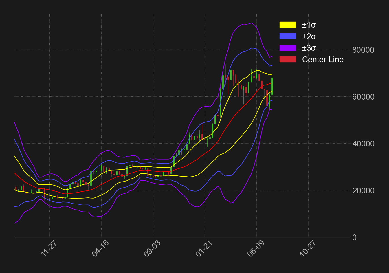 目先のBTCドルの上値目途としては、週足+2σや史上最高値が密集する73,190ドル〜74,742ドルエリアが注目される。相場が同エリアの上抜けに成功すれば、史上最高値更新に加え、5ヵ月以上に及ぶ高値でも保ち合いからの上放れとなり、相場上昇に拍車が掛かる可能性が指摘される。