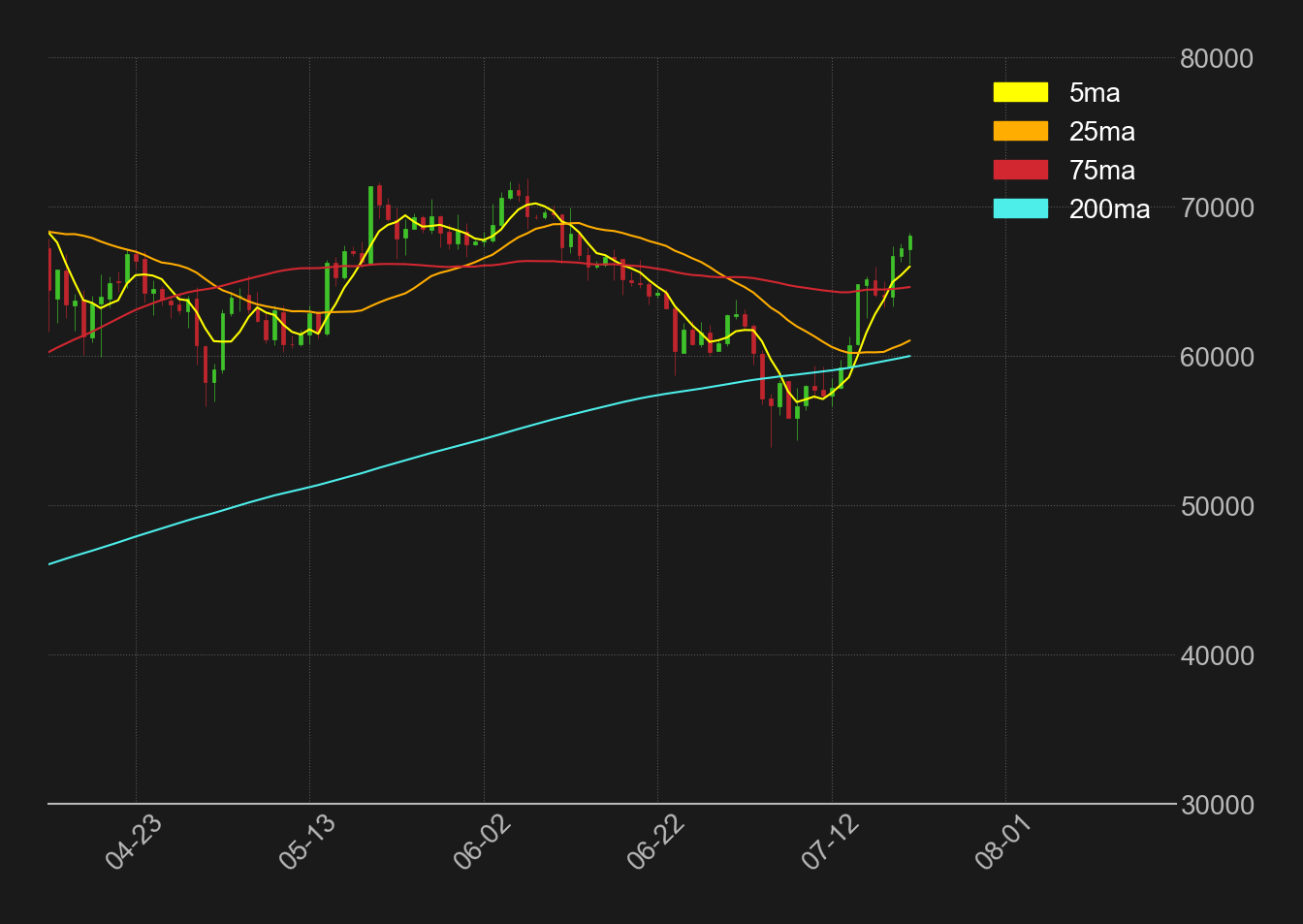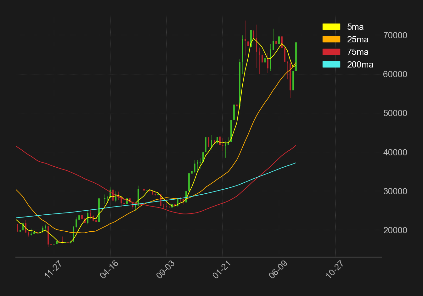 BTCドル週足の移動平均線は、5週線が25週線を下抜けデッドクロスが出現。しかし、相場は全ての移動平均線の上で推移し、地合いの強さを示している。