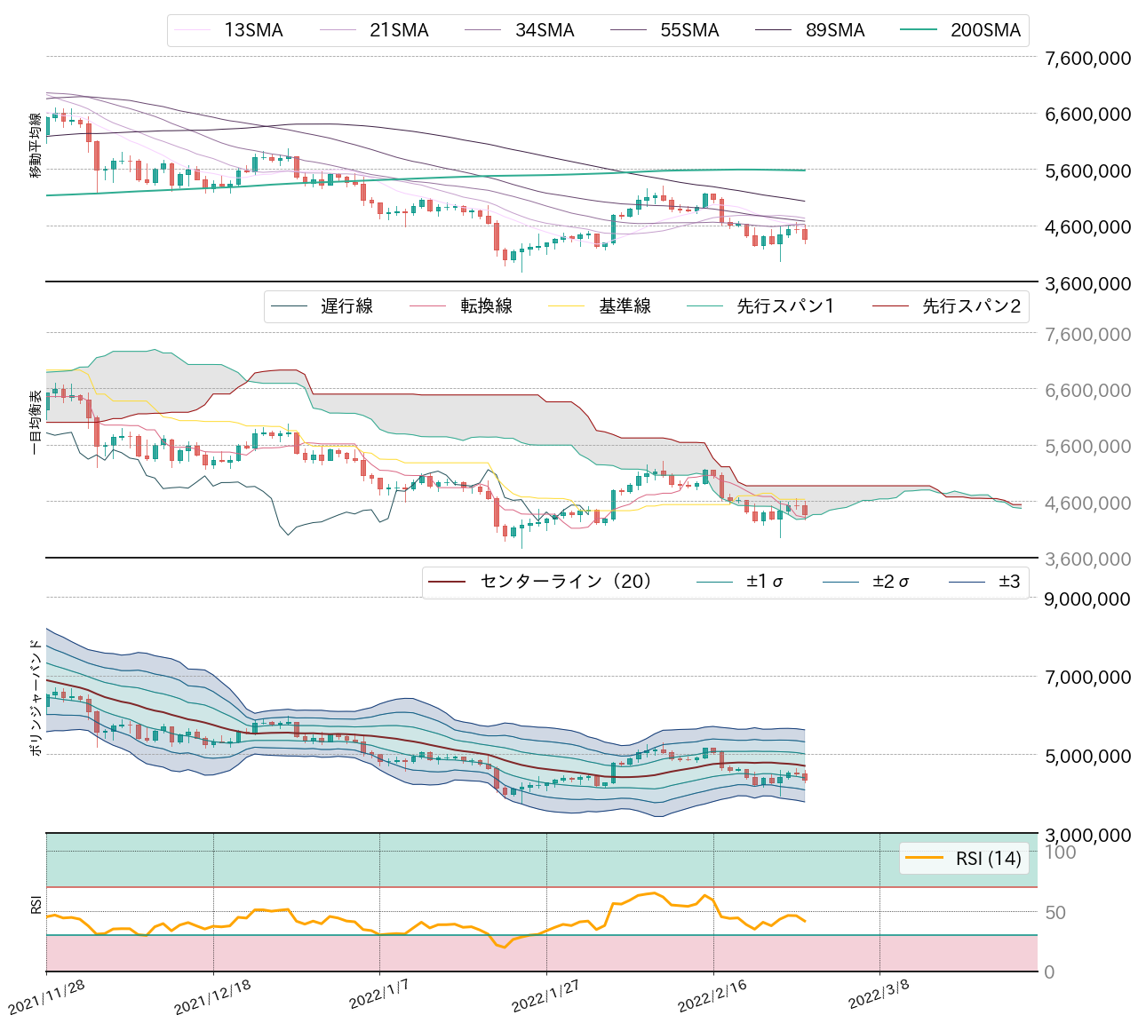 一方、その後のBTCは押し目買いの様相で徐々に値を戻すと、バイデン米大統領の対露追加経済制裁発表、さらに、開戦初日からウクライナ首都キーフ陥落は時間の問題との報もあり、軍事衝突が長期化しないとの期待感からか相場は上値を追う展開に転じ460万円にタッチした。しかし、対ドルで節目40,000ドルとなる同水準は相場のレジスタンスとなっており、欧州議会のMiCA草案投票延期もあったが、1月の米個人消費支出(PCE)上振れによる金融政策引き締め加速への警戒感から上値を抑えられた。
