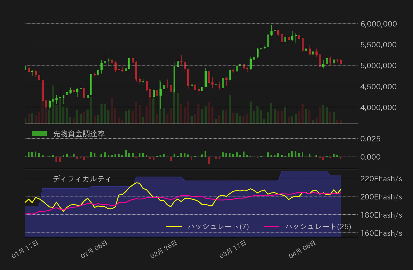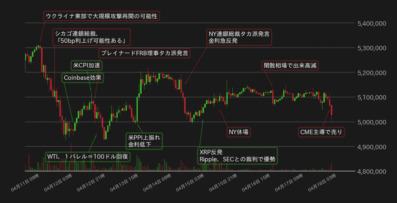15日(金)がグッド・フライデーでNY市場が休場だったこともあり、週末は閑散相場の様相を呈し510万円を挟み込み小動きとなったが、今朝方にシカゴマーケンタイル取引所(CME)のBTC先物が取引を再開すると、先物主導で再び上値を重くしている。