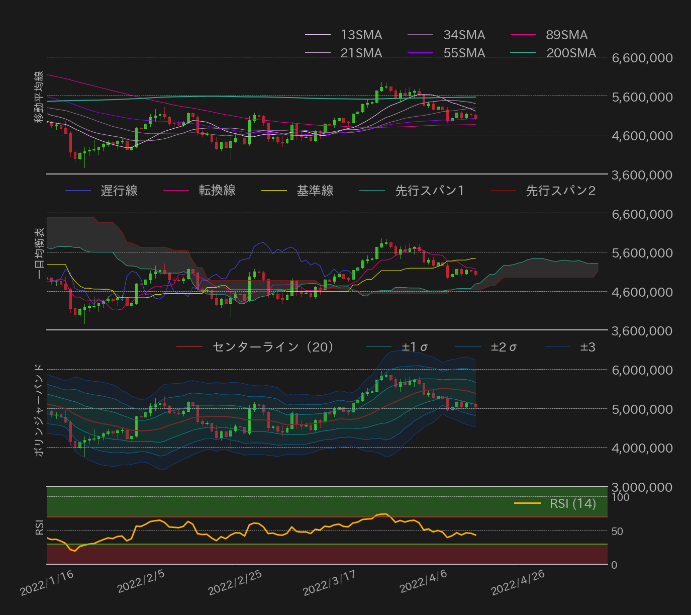 しかし、それ以降の相場は、Coinbaseのアルトコイン4銘柄新規上場を契機にアルト主導で下げ止まると、米国の消費者物価指数(CPI)と卸売物価指数(PPI)の上振れや、原油価格指標のウエストテキサスインターミディエート(WTI)の反発に伴うインフレ高進懸念に支えられた一方、ブレイナード米連邦準備制度理事会(FRB)理事とウイリアムスNY地区連銀総裁らのタカ派発言に上値を抑えられ、495万円から520万円のレンジで底堅くも上値の重い展開を繰り広げた。