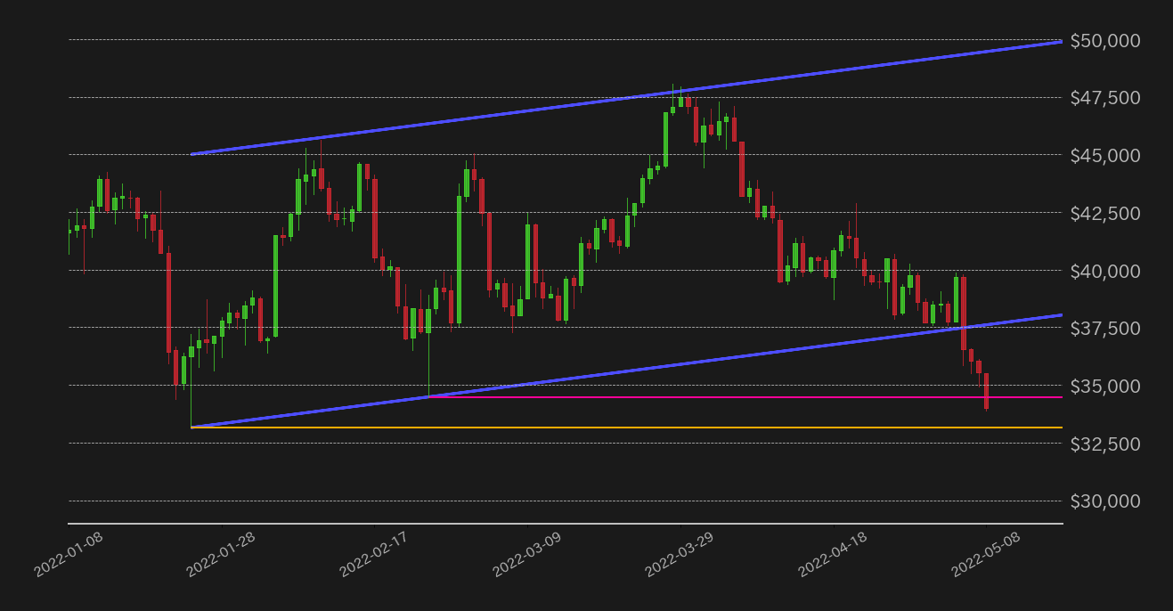 先週(5月2日〜8日)のビットコイン(BTC)対円相場は549,485円(10.98%)安の4,456,545円と大幅下落。対ドルでは6週続落となり、先週は昨年7月ぶりに週足終値で35,000ドルを下回った。
