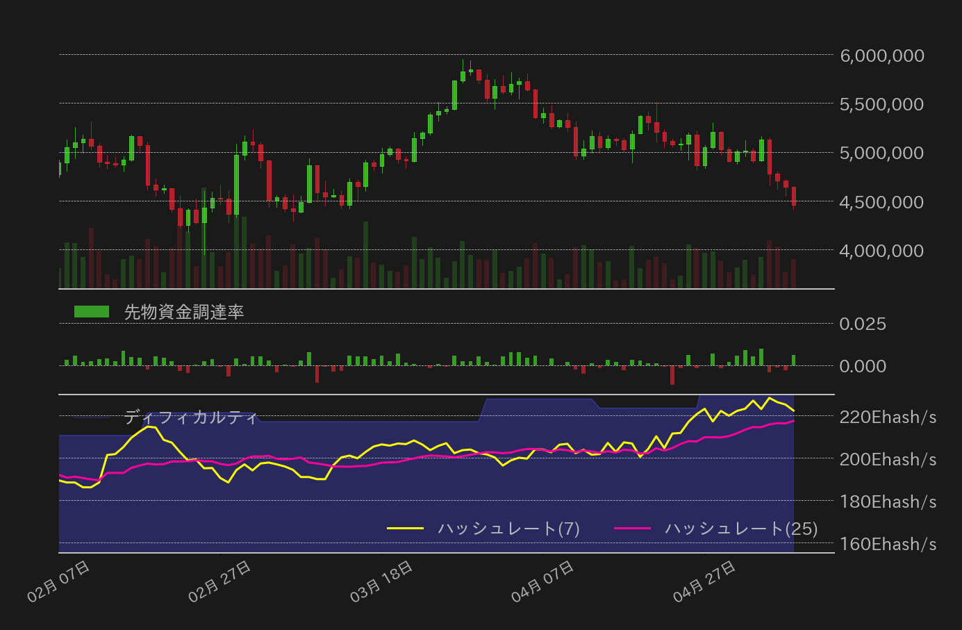 しかし、相場は対ドルで40,000ドル水準となる516万円で上値を抑えられると、米株の急反落に連れ安となる格好でBTCも40万円ほど急反落、6日の米雇用統計では、市場予想を上回る雇用者数の伸びと賃金の高止まりが確認され、インフレ圧力の持続が確認されたが、米株の続落が相場の重石となり、470万円での揉み合う展開となった。