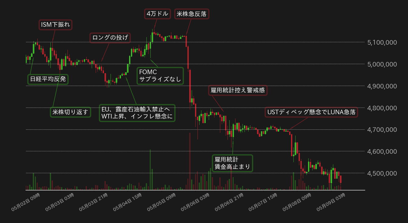 週末序盤の相場は、470万円で下げ止まる兆しを見せたが、Anchor Protocolからの巨額TerraUSD(UST=アルゴリズムによってドルの価値にペッグされたステーブルコイン)引き出しによるディペッグ(ドルとのペッグが外れる現象)が長期化したことで、UST発行に必要となるLUNAトークンの相場が急落。影響はBTCにも波及し、BTC相場は450万円周辺まで一段安を演じた。