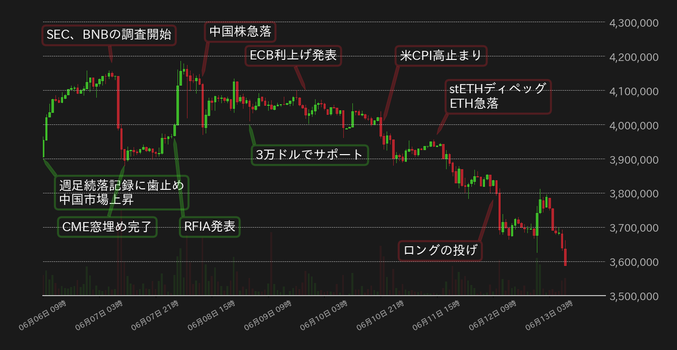 外国為替市場でのドル円相場急伸により、BTCの対円は中期レンジ内に12日の終値を納めたが、BTC対ドルは保ち合い下抜けの様相を呈している。下落の切っ掛けはやはり米CPIの高止まりと見ており、夏以降、年末まで利上げが継続される展開を市場は織り込みにきている格好だ。今週は16日午前3時に米連邦公開市場委員会(FOMC)の結果(政策金利誘導目標レンジ+声明)と、四半期に一度更新される経済見通し概要(Summary of Economic Projection)が公開される。